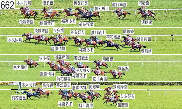 「同歡樂」於躍出時在「夢幻戰士」與「英友好友」之間受擠迫,當時「英友好友」被「福喜多多」碰撞,繼而向外斜跑避開該駒。在此宗事件中,「夢幻戰士」被「同歡樂」碰撞後軀後嚴重失去平衡。「飛龍降臨」於起步時向外斜跑,碰撞「鑲藍旗」。其後,自大外檔出閘的「鑲藍旗」收慢,在馬群之後切入以取得遮擋。「醒目再臨」於早段收慢以取得遮擋。接近九百米處轉彎時,「英友好友」將頭轉側及向著「福喜多多」的後蹄外閃。跑過六百米處時,「醒目再臨」靠近「荷花福星」的後蹄處於窘境。跑過四百米處時,「夢幻戰士」將頭轉側及內閃,在「英友好友」的後蹄外側處於窘境,當時「英友好友」移至「龍鳳情祥」外側以望空。接近三百五十米處時,「夢幻戰士」移至「英友好友」內側。「惜多福」受困而未能望空至跑過三百五十米處。過了三百米處後,「英友好友」與「福喜多多」互相碰撞。跑過二百米處時,「福喜多多」在「荷花福星」內側緊迫競跑。接近一百五十米處時,「同歡樂」自「飛龍降臨」及「夢幻戰士」之後向外移出以望空。末段,「夢幻戰士」頗為難以望空。五十米處,「同歡樂」失去左後蹄的蹄鐵。小組押後宣佈覆磅完畢,以考慮「明月昇輝」是否獲公平出閘。小組召見了該駒騎師蘇狄雄,以及觀看過賽事影片後,確定該駒在閘內站姿良好,開閘時煩躁不安,煩躁不安後將頭轉向左邊並伸進隔鄰閘廂。小組認為「明月昇輝」於開閘時煩躁不安令自己陷入困境,因而裁定該駒已獲公平出閘,並被視作為出賽馬匹。因為此宗事件,「明月昇輝」失地甚多,沒有參與競逐。「明月昇輝」必須試閘及格後,才可再次出賽。被查詢時,莫雷拉表示,他獲指示盡可能讓「龍鳳情祥」自第十檔出閘後居於大約中間位置。他說,他於早段催策坐騎,坐騎於過了千一米處後走大外疊,由於已無機會佔取中間位置,他遂選擇催策坐騎,並在領先馬匹之後取得遮擋,而非不必要地多走腳程。他說,這導致坐騎是日居於較賽前部署為前的位置。獸醫於賽後立即檢查「飛龍降臨」,並無發現任何明顯異常之處。「荷花福星」及「木火同明」均須抽取樣本檢驗。