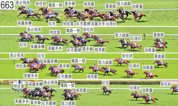 「相見歡」與「喜進龍」出閘均僅屬一般。「紅旺」於起步時向外斜跑,導致「勁力威龍」勒避及失地。在此宗事件中,「勁力威龍」向外斜跑並碰撞「紅衣震撼」,「紅衣震撼」因而失去平衡,向外斜跑並觸碰「放眼量」的後軀。其後,自外檔出閘的「紅衣震撼」、「放眼量」及「玩得好」均收慢並在馬群之後切入。「紅旺」自外檔出閘後於早段受催策以佔取前列位置,過了千三米處後走外疊時收慢以取得遮擋,但於過了九百米處後持續在沒有遮擋下走外疊。接近一千零五十米處時,「美麗多多」收慢避開「相見歡」的後蹄,當時「相見歡」於搶口之際向內斜跑,並在「明欣賞」的後蹄內側處於窘境。其後,「相見歡」持續搶口,接近九百五十米處時收慢避開「喜多樂」的後蹄,繼而於跑過九百米處時勒避該駒的後蹄。「相見歡」持續難以穩定走勢,過了八百米處後再度收慢避開「喜多樂」的後蹄。跑過九百米處時,「電路一號」在「皆旺財」與「保羅承傳」之間受擠迫,當時「皆旺財」向外斜跑避開「是必飛飛」的後蹄,而「保羅承傳」則向內斜跑。跑過六百米處時,「喜進龍」在「玩得好」與「勁力威龍」之間緊迫競跑,當時「勁力威龍」被「相見歡」帶向外跑。趨近二百米處時,賀銘年(「保羅承傳」)跌掉馬鞭。見習騎師陳嘉熙(「皆旺財」)因對已無爭逐機會的坐騎用鞭而遭到警告。賽後,獸醫應練馬師沈集成的要求替「皆旺財」進行內窺鏡檢查。獸醫報告,是次檢查顯示該駒的氣管內有很多血。「皆旺財」必須通過獸醫檢驗後,才可再次出賽。獸醫於賽後立即檢查「玩得好」及「紅旺」,並無發現任何明顯異常之處。「明欣賞」及「美麗多多」均須抽取樣本檢驗。