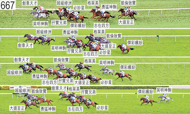 「傑彩繽紛」於躍出時在「創意天才」與「超級綠洲」之間受擠迫,當時「超級綠洲」出閘笨拙並向外斜跑。在此宗事件中,「創意天才」被「傑彩繽紛」碰撞後失去平衡。「英明神駒」及「凱倫致寶」自外檔出閘後均於早段收慢以取得遮擋。「大道至正」於早段收慢以取得遮擋時昂首。趨近及跑過千六米處時,「勇猛神駒」在收慢以取得遮擋時搶口。其後在一段途程上,「勇猛神駒」持續搶口,靠近「必妙星」的後蹄處於極大窘境。過了千四米處後,「英明神駒」在沒有遮擋下走外疊,賽事中段步速減慢時獲許上前,於接近八百米處時居領放馬外側。跑過千二米處時,「必妙星」開始大力搶口,靠近「孖寶兄弟」的後蹄處於窘境。跟隨「必妙星」的「勇猛神駒」於跑過一千米處時持續難以穩定走勢之際勒避該駒後蹄。趨近九百米處時,持續十分難以穩定走勢的「必妙星」勒避「孖寶兄弟」的後蹄,並碰撞「傑彩繽紛」,導致「傑彩繽紛」受阻礙及被帶出更外疊。其後,「必妙星」及「傑彩繽紛」均在沒有遮擋下走外疊。郭能(「孖寶兄弟」)被裁定一項不小心策騎〔賽事規例第100(1)條〕,事緣於趨近三百米處時,他容許坐騎在尚未帶離「大道至正」時向外斜跑,導致該駒嚴重受阻,並相應被帶向外跑,令「必妙星」在「志在四方」內側受擠迫。小組判罰郭能於六月三日星期三跑馬地賽事停賽。因此,郭能可於六月四日星期四恢復策騎出賽。此外,郭能被罰款一萬七千五百元。跑過五十米處時,「凱倫致寶」在催策下向外斜跑,導致騎師須停止催策並修正坐騎。賽後,賀銘年表示,是賽陣上形勢不合「傑彩繽紛」發揮,因為坐騎自接近九百米處起須在沒有遮擋下走外疊,然而坐騎在六百米處前已須受大力催策,末段未能以勁勢衝刺。他說,他認為「傑彩繽紛」走勢平平。獸醫於賽後立即檢查「傑彩繽紛」,並無發現任何明顯異常之處。「大道至正」及「超級綠洲」均須抽取樣本檢驗。