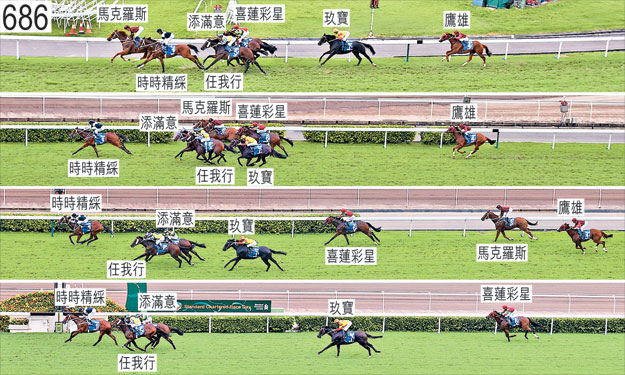 進入直路時,「喜蓮彩星」向外移出避開「馬克羅斯」的後蹄,當時「馬克羅斯」正在墮退。其後,「馬克羅斯」轉弱,包尾大敗而回。獸醫於賽後立即檢查「馬克羅斯」,並無發現任何明顯異常之處。小組認為「馬克羅斯」的表現難以接受。「馬克羅斯」必須試閘及格,並且通過獸醫檢驗後,才可再次出賽。過了四百米處後,「添滿意」與「任我行」緊迫競跑。趨近三百米處時,「添滿意」向外斜跑,碰撞「任我行」,兩駒因而雙雙失去平衡。被查詢時,蔡明紹表示,賽前預期「馬克羅斯」將為是賽領放馬,他獲指示於早段催策「任我行」以佔取「馬克羅斯」外側的位置。他說,由於賽前預期是賽熱門「時時精綵」將須自坐騎之後上前,因此他獲進一步指示讓坐騎於一千米處展步上前,以確保是賽成為真正的耐力考驗。他說,坐騎儘管於早段受催策,但前速不如排其外側檔位的「時時精綵」。他說,他於早段在一段途程上持續催策坐騎,但顯然他須消耗坐騎許多氣力才能嘗試領先「時時精綵」,因此他選擇於跑了二百米後佔取該駒之後有遮擋的位置。他說,他於早段及中段跟隨「時時精綵」,其後於接近一千米處時將坐騎向外移出並讓其推進,以加快賽事步速讓坐騎回到「時時精綵」之後的位置或者繞過該駒推進。他說,他於過了一千米處後推進至「時時精綵」外側,「添滿意」及「喜蓮彩星」均於此時得以在坐騎內側上前,而由於「時時精綵」保持在「馬克羅斯」外側,他未能向內移入至「時時精綵」之後。他續說,坐騎於跑過八百米處時脫口,他須在一段途程上催策坐騎以保持位置。他說,這包括他須於五百米處前對坐騎用鞭。他說,坐騎對催策反應良佳,其後於直路上保持強勁衝刺。獸醫於賽後立即檢查「鷹雄」,發現該駒患有「喘鳴症」,而該駒過往也有此毛病報告。「時時精綵」及「任我行」均須抽取樣本檢驗。