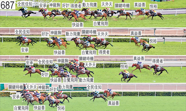 「悅裕」於開閘時四足滯立,因而失地甚多。小組考慮到「悅裕」以往有出閘緩慢的紀錄,著令該駒必須試閘及格後,才可再次出賽。「天外天」於躍出時在雙雙斜跑的「白鷺飛翔」與「得獎者」之間受擠迫之際勒避。在此宗事件中,「天外天」踢中他駒後蹄後失蹄,而「白鷺飛翔」及「得獎者」均因與「天外天」互相觸碰而嚴重失去平衡。起步後跑了一段短途程後,「動力飛鷹」受阻礙及收慢避開「好計」的後蹄,當時「好計」被「全民佳知」帶向外跑。「關鍵時機」自大外檔出閘後於早段在馬群之後切入。跑過千一米處時,「白鷺飛翔」收慢避開「得獎者」的後蹄,當時「得獎者」收慢以在「好計」之後取得遮擋。「白鷺飛翔」於跑過一千米處時失去左後蹄的蹄鐵。「得獎者」於過了九百米處後在沒有遮擋下走外疊,直路上墮退,包尾大敗而回。獸醫於賽後立即檢查「得獎者」,並無發現任何明顯異常之處。小組認為「得獎者」的表現難以接受。「得獎者」必須試閘及格,並且通過獸醫檢驗後,才可再次出賽。跑過二百米處時,「天外天」向內移入避開「全民佳知」的後蹄,當時「全民佳知」正在墮退。「快益善」沿途走外疊,沒有遮擋。賽後,見習騎師黃俊表示,「全民佳知」在單騎領放下走勢暢順,其後在「安承」於跑過四百米處時上前與牠並跑之際隨即須受催策。他說,坐騎其後須受力策,較後階段轉弱,表現令人失望。獸醫於賽後立即檢查「全民佳知」,並無發現任何明顯異常之處。「關鍵時機」及「安承」均須抽取樣本檢驗。