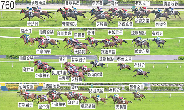「仙履奇遇」出閘笨拙,繼而被「晉神」碰撞,當時「晉神」向外斜跑。「奇妙日」於起步時向內斜跑,妨礙「良朋共盛」。「都會之星」於起步時向外斜跑,碰撞「旅遊拿督」,「旅遊拿督」相應向外斜跑,導致「有錢分」在「騰龍超影」內側受擠迫,而「騰龍超影」則因「有錢分」向外斜跑及碰撞其後軀而失去平衡。「有毅君子」自外檔出閘笨拙及失地,其後在馬群之後切入。「騰龍超影」於早段在一段短途程上受催策,跑過一千一百五十米處時收慢以取得遮擋,趨近千一米處時被「有錢分」碰撞後失去平衡,當時「有錢分」被「旅遊拿督」帶向外跑,而「旅遊拿督」相應被「都會之星」帶向外跑,「都會之星」則將頭轉側及向外斜跑避開「皇帝賽」。在此宗事件中,在「騰龍超影」外側競跑的「帝豪精彩」急促向外移出,導致「天賜寶」受妨礙。「皇帝賽」儘管於早段受催策,但加速緩慢。「都會之星」於早段失去左前蹄的蹄鐵。過了六百米處後轉彎時,「天賜寶」被「皇帝賽」碰撞,當時「皇帝賽」在「良朋共盛」外側處於窘境,而「良朋共盛」則在轉彎時走勢笨拙。接近二百米處時,「旅遊拿督」在「良朋共盛」(蔡明紹)與「有毅君子」(薛恩)之間受擠迫之際勒避,當時「良朋共盛」起初向內斜跑,對「旅遊拿督」造成擠迫,而「有毅君子」則向外移出以望空。儘管小組接納「良朋共盛」及「有毅君子」兩駒的移動造成「旅遊拿督」受擠迫,但無論如何仍告誡蔡明紹,在類似情況下必須加倍小心;同時譴責薛恩,並告誡他在轉換坐騎的跑線以望空時須加倍小心。「天賜寶」沿途在沒有遮擋下走外疊。賽後,「皇帝賽」(何澤堯)被發現身上有鞭痕。何澤堯被罰款七千五百元。在衡量處罰輕重時,小組考慮到何澤堯今季早前已曾因同類事件而受罰。獸醫於賽後立即檢查「旅遊拿督」及「有錢分」,並無發現任何明顯異常之處。「有毅君子」及「仙履奇遇」均須抽取樣本檢驗。