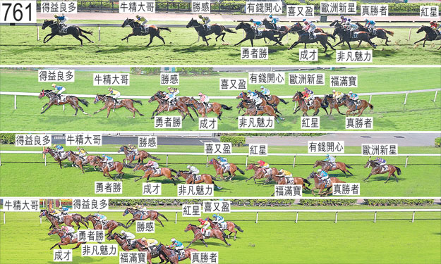 「歐洲新星」在閘內煩躁不安,出閘十分笨拙,因而失地。「牛精大哥」於開閘時一對前腳並舉,向內斜跑,阻礙「有錢開心」。「真勝者」出閘僅屬一般。「非凡魅力」及「勇者勝」均於躍出時在雙雙斜跑的「勝感」與「成才」之間受擠迫。其後,「非凡魅力」在馬群之後切入以取得遮擋。自外檔出閘的「紅星」及「福滿寶」均於早段在馬群之後切入。接近一千零五十米處轉彎時,「非凡魅力」在「喜又盈」的後蹄外側處於窘境,當時「喜又盈」向外斜跑。「真勝者」於過了六百米處後轉彎時走勢十分笨拙,向外斜跑,導致「紅星」被碰撞及被帶出更外疊。其後於跑過五百米處時,在「福滿寶」推進至靠近「歐洲新星」的後蹄競跑之際,「真勝者」在「紅星」與「福滿寶」之間緊迫競跑。跑過四百米處時,「歐洲新星」收慢避開「有錢開心」的後蹄。直路上,「非凡魅力」在催策下外閃。「成才」沿途在沒有遮擋下走外疊。獸醫於賽後立即檢查「有錢開心」及「紅星」,並無發現任何明顯異常之處。獸醫於賽後立即檢查「歐洲新星」,內窺鏡檢查顯示該駒的氣管內有很多痰。「牛精大哥」及「得益良多」均須抽取樣本檢驗。