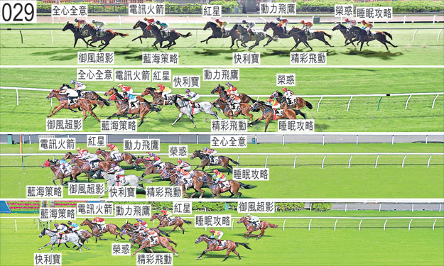 「電訊火箭」於起步後不久向外斜跑,挨擦「藍海策略」的後軀。自外檔出閘的「榮惑」及「睡眠攻略」均於早段在馬群之後切入。首次跑過終點時,「御風超影」一度在「全心全意」的內側緊迫競跑。接近六百五十米處時,「睡眠攻略」與「榮惑」互相碰撞。跑過四百米處時,「精彩飛動」在「快利寶」(田泰安)移至「藍海策略」的外側以望空之際受阻礙。小組告誡田泰安,在類似情況下須加倍小心。跑過二百五十米處時,「電訊火箭」在「御風超影」的內側緊迫競跑,當時「御風超影」向內斜跑。接近一百五十米處時,「榮惑」向外移出避開「動力飛鷹」的後蹄,當時「動力飛鷹」向外斜跑。被查詢有關「全心全意」的表現時,莫雷拉表示,坐騎自外檔出閘,他於早段催策坐騎以帶離馬群,其後坐騎於中段在領放下走勢良佳。他說,他滿意坐騎於中段的走勢,預期坐騎將於末段以佳勢衝刺,特別是考慮到坐騎於是晚賽事前的試閘中由他策騎時表現良佳。他說,跑過五百米處時,他須於較他預期為早的階段開始催策坐騎,而坐騎立即脫口,且未能如他預期般加速。他說,坐騎於轉直路彎時保持同速,但於入直路時立即須受力策,顯著墮退,這令他感到疑慮。他續說,坐騎由初時居領先位置,到墮退至二百米處前居馬群包尾位置,雖然他於末段未有持續力策坐騎,但坐騎持續急促墮退。他說,鑒於坐騎於陣上轉弱的表現,他於返回解鞍處時特別留意坐騎的動作,但他並未察覺任何或能解釋坐騎表現不佳的不妥之處。「全心全意」的練馬師姚本輝說,該駒上季最後一仗表現令人失望,而是晚賽事前的試閘表現良佳。他說,「全心全意」在那次試閘後也表現良佳,令他感到滿意。他說,根據那次試閘,他預期「全心全意」將於是晚賽事交出好表現。然而,「全心全意」於直路上轉弱,表現再次令他感到失望,而他未能就此提供任何解釋。獸醫於賽後立即檢查「全心全意」,並無發現任何明顯異常之處。由於這是「全心全意」連續第二次於陣上轉弱,並表現令人失望,小組著令該駒必須連續多次試閘及格,並且通過須包括額外診斷評估的獸醫檢驗後,才可再次出賽。獸醫於賽後立即檢查「御風超影」及「睡眠攻略」,並無發現任何明顯異常之處。「全心全意」、「快利寶」及「藍海策略」均須抽取樣本檢驗。