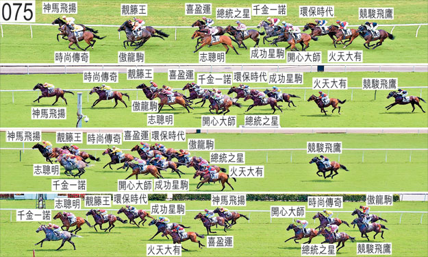 「時尚傳奇」出閘緩慢。「成功星駒」於起步時向內斜跑,妨礙「神馬飛揚」。「成功星駒」於早段搶口。趨近千二米處時在一段途程上,「時尚傳奇」走勢欠順。跑過千一米處時,「開心大師」自己推進至「成功星駒」與「時尚傳奇」之間,當時該處空位不足,繼而在勒避時開始十分搶口及失地。持續搶口的「時尚傳奇」在被「開心大師」碰撞後軀時嚴重失去平衡。在此宗事件中,「時尚傳奇」失去右後蹄的蹄鐵。其後,「開心大師」持續十分難以放鬆來跑。「時尚傳奇」其後在沒有遮擋下走大外疊,過了一千米處後獲許上前,接近八百米處時居領放馬外側。九百米處轉彎時,「喜盈運」將頭轉側及向著外側的「靚籐王」的後蹄斜跑,因而失地。跟隨「喜盈運」的「千金一諾」在該駒之後處於窘境。跑過七百米處時,「環保時代」嘗試自「千金一諾」之後向外移出,因而與「成功星駒」緊迫競跑。跑過三百米處時,「環保時代」在「喜盈運」內側緊迫競跑。小組告誡「傲龍駒」的騎師波健士,不要對已無爭逐機會的馬匹用鞭。獸醫於賽後立即檢查「總統之星」及「開心大師」,並無發現任何明顯異常之處。「千金一諾」及「志聰明」均須抽取樣本檢驗。