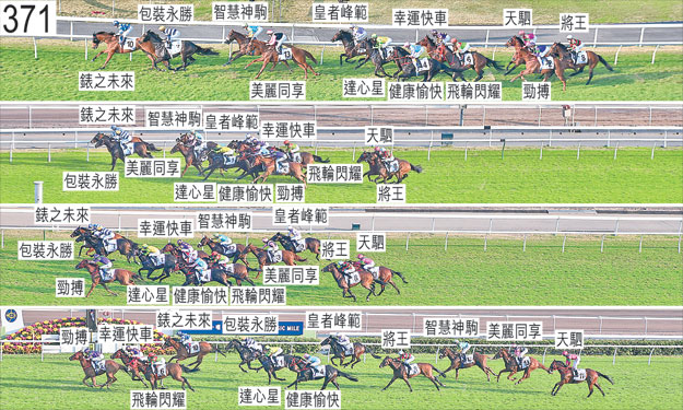 「莎皇者」入閘後煩躁不安,左後腿卡在閘廂後門上。「莎皇者」被牽出閘廂接受獸醫檢查,獸醫認為該駒不適宜出賽。小組按照獸醫意見著令「莎皇者」退出。「莎皇者」必須試閘及格,並且通過獸醫檢驗後,才可再次出賽。「天駟」就在開閘前煩躁不安,因而漏閘。「天駟」必須試閘及格後,才可再次出賽。「皇者峰範」與「達心星」於躍出時互相碰撞。「將王」自外檔出閘後於早段在馬群之後切入。「幸運快車」於早段失去左前蹄的蹄鐵。千一米處,「喜豐寶」有不妥,因而急促失地。跟隨「喜豐寶」的「皇者峰範」因而須勒避。「達心星」、「飛輪閃耀」及「勁搏」同樣均受阻礙。賽後,獸醫報告,「喜豐寶」左前腿有一處損傷。「美麗同享」於九百五十米處在「包裝永勝」之後切入以取得遮擋之際開始搶口,繼而勒避「包裝永勝」的後蹄,當時「包裝永勝」正在領放馬「錶之未來」的外側收慢。「美麗同享」在勒避後推進至「包裝永勝」的後蹄內側競跑及向內斜跑,「智慧神駒」因而受擠迫壓向內欄。跟隨其後的「達心星」因而被迫向外移出避開「美麗同享」的後蹄。趨近九百米處時,「健康愉快」在沒有遮擋下走外疊。「飛輪閃耀」自入直路起受困而未能望空直至趨近二百米處。「皇者峰範」於直路早段難以望空。「幸運快車」同樣受困而未能望空至跑過三百米處後。被查詢時,莫雷拉表示,「達心星」雖然在「美麗同享」於首個彎位勒避時受妨礙,但在此宗事件後持續走勢良佳,他預期坐騎於直路早段移出外疊時能展現加速力。他說,然而坐騎是日在直路上速度甚為平均,走勢平平。他說,他未能就「達心星」於末段未能如往常般以勁勢衝刺提供任何解釋。獸醫於賽後立即檢查「達心星」,並無發現任何明顯異常之處。被查詢時,潘頓表示,賽前擬讓「包裝永勝」佔取較前位置,並且希望可在領先馬匹之後取得遮擋。他說,馬主及練馬師也表示,若坐騎能在未受挑戰下取得領先,則他也可選擇讓坐騎領放。坐騎是日出閘遠較平時快,他於早段積極催策坐騎,過了千二米處後在「錶之未來」取得領先時讓坐騎向內切入以跟隨該駒。他說,坐騎中段沿途走勢令人滿意,但於末段未能以勁勢衝刺,表現令人失望。獸醫於賽後立即檢查「包裝永勝」,內窺鏡檢查顯示該駒的氣管內有很多血,同時發現該駒的右後腿被踢中。「包裝永勝」必須通過獸醫檢驗後,才可再次出賽。獸醫於賽後立即檢查「智慧神駒」,內窺鏡檢查顯示該駒的氣管內有很多痰。獸醫於賽後立即檢查「天駟」,並無發現任何明顯異常之處。「達心星」、「勁搏」及「幸運快車」均須抽取樣本檢驗。「喜豐寶」也須抽取樣本檢驗。