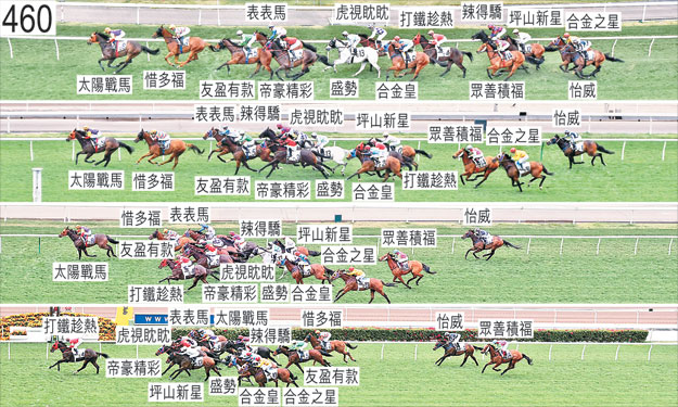 「盛勢」於起步時向外斜跑,碰撞「友盈有款」,「友盈有款」因而失去平衡,向外斜跑,妨礙「太陽戰馬」。「眾善積福」於起步時向外斜跑,阻礙「打鐵趁熱」。「打鐵趁熱」其後於早段收慢,在馬群之後切入。「坪山新星」與「合金之星」於躍出時互相碰撞。其後,自外檔出閘的「合金之星」及「坪山新星」均在馬群之後切入以取得遮擋。「帝豪精彩」於起步時向外斜跑,妨礙「合金皇」。自外檔出閘的「怡威」及「辣得驕」均於早段收慢以取得遮擋。接近九百五十米處時,「合金皇」收慢避開「帝豪精彩」(賀銘年)的後蹄,當時「帝豪精彩」在尚未充分帶離下向內斜跑。小組告誡賀銘年,在類似情況下須加倍小心。跟隨「合金皇」的「眾善積福」因而在該駒之後處於窘境。過了九百米處後,「帝豪精彩」走外疊,沒有遮擋。過了九百米處後轉彎時,「友盈有款」將頭轉側及外閃,接近五百五十米處時向外斜跑避開「惜多福」,碰撞「帝豪精彩」,「帝豪精彩」因而失去平衡。趨近七百米處時,「虎視眈眈」搶口及靠近「表表馬」的後蹄競跑。跑過四百米處時,「辣得驕」嘗試在「表表馬」內側取位,當時該處空位不足,繼而收慢。「辣得驕」其後嚴重受困而未能望空至過了一百米處後,因而未能全力施為。跑過二百米處時,「辣得驕」在「惜多福」及「虎視眈眈」之後受困而未能望空之際向外斜跑,碰撞「虎視眈眈」的後軀,當時「虎視眈眈」在「友盈有款」內側緊迫競跑。這導致「虎視眈眈」於接近一百五十米處時失去平衡,同時於此階段被「友盈有款」碰撞,當時「友盈有款」在被「帝豪精彩」碰撞後向內斜跑。「盛勢」自入直路起受困而未能望空至跑過二百米處,並於此階段移至「帝豪精彩」外側以望空。直路早段,「坪山新星」難以望空,過了二百米處後向外移出數疊以望空。趨近五十米處時,「坪山新星」將頭轉側及外閃,導致「盛勢」及「合金皇」均受妨礙。何澤堯報告,他獲指示以較留後方式策騎「合金皇」,因為坐騎曾在居前競跑下於末段未能以勁勢衝刺。賽後,莫雷拉表示,「怡威」在閘內十分煩躁不安,其後全程動作感覺欠順,發出異常呼吸聲,其後於末段未能以勁勢衝刺。獸醫於賽後立即檢查「怡威」,發現該駒會厭被覆蓋。「怡威」必須通過獸醫檢驗後,才可再次出賽。被查詢有關「友盈有款」令人失望的表現時,楊明綸表示,坐騎起初在「太陽戰馬」之後取得遮擋,其後走勢暢順。他說,然而於過了八百米處後,「太陽戰馬」上前超越「惜多福」以靠欄競跑,導致坐騎失去遮擋。他說,坐騎在失去遮擋後立即開始外閃,轉彎時仍繼續外閃。他又說,坐騎於接近五百五十米處時失去平衡,直路早段僅能保持同速,接近一百五十米處時受擠迫,末段轉弱。獸醫於賽後立即檢查「友盈有款」,內窺鏡檢查顯示該駒的氣管內有很多血。「友盈有款」必須通過獸醫檢驗後,才可再次出賽。獸醫於賽後立即檢查「惜多福」,並無發現任何明顯異常之處。「打鐵趁熱」及「帝豪精彩」均須抽取樣本檢驗。