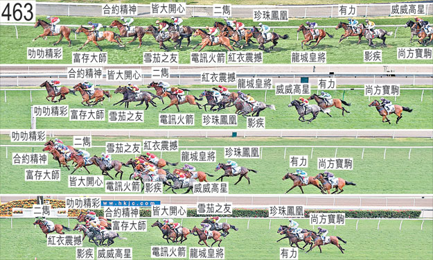 「齊快活」於二月二十六日被小組按照獸醫意見(右前腿不良於行)著令退出,並由後備馬匹「尚方寶駒」補上。「齊快活」必須通過獸醫檢驗後,才可再次出賽。「紅衣震撼」與「珍珠鳳凰」於起步時互相碰撞。「影疾」、「威威高星」及「尚方寶駒」均於早段收慢,在馬群之後切入以取得遮擋。跑過千三米處時,「紅衣震撼」及「珍珠鳳凰」均在「電訊火箭」的內側緊迫競跑,當時「電訊火箭」將頭轉側,向內斜跑避開「合約精神」,而「合約精神」則在向內斜跑後向外移出避開「電訊火箭」。跑過千一米處時,「影疾」一度靠近「龍城皇將」的後蹄處於窘境,當時「龍城皇將」向內斜跑,繼而向外移回。同樣於跑過千一米處時,「珍珠鳳凰」及「電訊火箭」雙雙斜跑,「珍珠鳳凰」因而收慢避開「電訊火箭」的後蹄。「珍珠鳳凰」在靠近「電訊火箭」的後蹄處於窘境之際昂首。接近九百五十米處時,正推進至靠近「雪茄之友」的後蹄競跑的「紅衣震撼」將頭轉側,自該駒之後向外移出,同時碰撞「珍珠鳳凰」,兩駒因而雙雙失去平衡。過了九百米處後,「電訊火箭」在沒有遮擋下走外疊。進入直路時,「皆大開心」嘗試移至轉直路彎時走勢笨拙的「富存大師」外側,因而與「雪茄之友」緊迫競跑。趨近四百米處時,「富存大師」稍為向內移回,正推進至「叻叻精彩」與「富存大師」之間的窄位的「合約精神」因而一度在窄位競跑。其後,「合約精神」在「叻叻精彩」與「富存大師」之間望空,因而與「富存大師」互相碰撞。正跟隨「富存大師」的「皆大開心」在該駒之後處於窘境之際向外斜跑,同時碰撞「雪茄之友」,「雪茄之友」因而失去平衡,向外斜跑避開「皆大開心」,導致「電訊火箭」受阻並被帶向外跑橫越「珍珠鳳凰」的跑線,當時「珍珠鳳凰」勒避「電訊火箭」的後蹄。由於此宗事件涉及相當多項因素,因此小組不採取進一步行動。跑過三百米處時,「二雋」移至「富存大師」的外側以望空。接近二百五十米處時,「皆大開心」將頭轉側及外閃,導致騎師須改以左手握鞭。其後,「皆大開心」持續在催策下外閃。趨近二百米處時,「龍城皇將」在「電訊火箭」的後蹄外側處於窘境,當時「電訊火箭」將頭轉側及外閃。獸醫於賽後立即檢查「電訊火箭」,內窺鏡檢查顯示該駒的氣管內有很多痰。獸醫於賽後立即檢查「珍珠鳳凰」,並無發現任何明顯異常之處。「富存大師」、「二雋」及「紅衣震撼」均須抽取樣本檢驗。