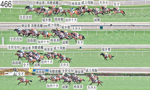 「全民佳知」在亮相圈踢中欄杆,抵達閘廂後接受獸醫檢查,獸醫認為該駒適宜出賽。「天外天」出閘緩慢。「威闖」於起步時向外斜跑,碰撞「加州十大」的後軀。趨近千六米處時,「加州十大」向內移入避開「高瞻遠矚」(莫雷拉)的後蹄,當時「高瞻遠矚」向內移入,繼而向外移回。小組譴責莫雷拉,並告誡他在類似情況下轉換跑線時須確保已充分帶離。過了千二米處後,「福多寶」走外疊,沒有遮擋,接近一千米處時自己失去平衡。「福多寶」其後在直路上墮退,包尾大敗而回。獸醫於賽後立即檢查「福多寶」,內窺鏡檢查顯示該駒的氣管內有很多痰,同時發現該駒患有「喘鳴症」,而該駒過往也有此毛病報告。小組認為「福多寶」的表現難以接受。「福多寶」必須試閘及格,並且通過獸醫檢驗後,才可再次出賽。「高瞻遠矚」自入直路起未能望空至接近二百米處。接近二百米處時,「高瞻遠矚」在推進至「全民佳知」與「樂益善」之間的窄位後,在「全民佳知」(梁家俊)外側緊迫競跑至過了一百米處後,當時「全民佳知」在催策下向外斜跑。小組譴責梁家俊,並告誡他,小組認為他應遠較今次更早修正坐騎。跑過一百米處時,「格萊美」向外移出避開「樂益善」的後蹄。被查詢有關「樂益善」令人失望的表現時,田泰安表示,賽前預期排在坐騎內側檔位的「路路醒」或會領放,令自外檔出閘的坐騎有機會與該駒一同切入並佔取前列位置。他說,坐騎於早段起初跟隨「路路醒」切入,他於趨近及跑過千三米處時須消耗坐騎一些氣力以帶離「路路醒」,「路路醒」於此階段居領放馬「全民佳知」之後,走第二疊。他說,儘管他於此階段毋須催策坐騎以推進,但他確實認為坐騎上前超越「路路醒」頗為耗力。他說,坐騎切入至「全民佳知」外側後走勢僅屬一般,當「福多寶」於過了七百米處後繞過坐騎上前時,坐騎立即須受催策。他說,他於轉直路彎時嘗試留住坐騎,因為他擔心坐騎於末段的衝刺將不及預期快,他於直路早段開始催策坐騎,坐騎其後於末段未能以勁勢衝刺,表現令人失望。他又說,今仗僅是坐騎在港第三仗,坐騎上仗勝出時能夠在領放馬之後取得遮擋,情況與今仗不同。獸醫於賽後立即檢查「樂益善」,並無發現任何明顯異常之處。是賽熱門「樂益善」上仗勝出,小組認為該駒今仗的表現難以接受。「樂益善」必須試閘及格,並且通過獸醫檢驗後,才可再次出賽。獸醫於賽後立即檢查「威力飛馳」,並無發現任何明顯異常之處。「樂益善」、「全才」及「路路醒」均須抽取樣本檢驗。