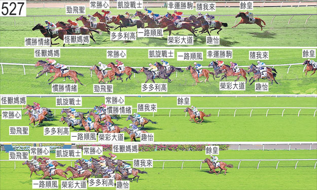 「幸運勝駒」出閘僅屬一般,躍出時在「多多利高」與「凱旋戰士」之間受擠迫,當時「凱旋戰士」向外斜跑。「隨我來」於躍出時被「餘皇」碰撞,當時「餘皇」向內斜跑。「趣怡」自外檔出閘笨拙,其後於早段在馬群之後切入。自外檔出閘的「榮彩大道」同樣於早段在馬群之後切入以取得遮擋。趨近八百米處時,「趣怡」向外移出避開「榮彩大道」的後蹄。「凱旋戰士」於過了六百米處後轉彎時走勢笨拙。進入直路後不久,「慣勝情緒」將頭轉側及內閃,其後墮退。賽後,莫雷拉表示,「慣勝情緒」於過了五百米處後須受力策,而坐騎於入直路後迅速墮退,令他感到疑慮。他說,坐騎轉弱的方式顯示牠可能出現內在毛病。獸醫於賽後立即檢查「慣勝情緒」,並無發現任何明顯異常之處。考慮了「慣勝情緒」墮退時的表現及騎師莫雷拉於賽後的意見後,小組著令「慣勝情緒」必須試閘及格,並且通過獸醫檢驗後,才可再次出賽。過了五十米處後,「幸運勝駒」在「凱旋戰士」的內側緊迫競跑,當時「凱旋戰士」將頭轉側及內閃。接近終點時,「怪獸媽媽」在「幸運勝駒」的內側緊迫競跑。獸醫於賽後立即檢查「隨我來」及「餘皇」,發現兩駒的右前腿均不良於行。「隨我來」及「餘皇」均必須通過獸醫檢驗後,才可再次出賽。獸醫於賽後立即檢查「怪獸媽媽」,並無發現任何明顯異常之處。「怪獸媽媽」、「勁飛聖」及「常勝心」均須抽取樣本檢驗。