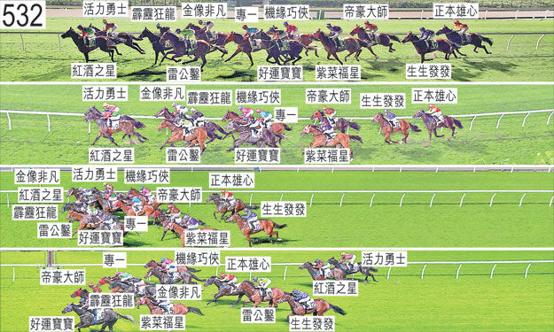 「帝豪大師」出閘緩慢。「正本雄心」出閘十分笨拙,起步時向內斜跑,碰撞「好運寶寶」的後軀。自外檔出閘的「正本雄心」其後在馬群之後切入。「好運寶寶」於早段收慢以取得遮擋。「雷公鑿」儘管於早段在一段不短的途程上受力策,但加速緩慢,首次跑過終點時在馬群之後切入以取得遮擋。跑過千四米處時,「活力勇士」與「霹靂狂龍」互相挨擦。「金像非凡」於趨近千三米處時收慢以讓「活力勇士」過頭之際向外斜跑,碰撞「專一」。過了千二米處後,「霹靂狂龍」於收慢以圖取得遮擋之際搶口。趨近一千米處時,「紫菜福星」向外斜跑,碰撞「好運寶寶」。「紅酒之星」在沒有遮擋下走外疊至接近九百米處,「雷公鑿」於此階段走外疊,沒有遮擋。過了六百米處後轉彎時,「紅酒之星」與「活力勇士」互相碰撞。同樣於過了六百米處後轉彎時,「霹靂狂龍」將頭轉側,向著「雷公鑿」的後蹄外閃。轉直路彎時,「雷公鑿」被「霹靂狂龍」碰撞,當時「霹靂狂龍」移至「紅酒之星」外側。跑過三百米處時,「金像非凡」將頭轉側及內閃,在「活力勇士」的後蹄外側處於窘境。同樣於跑過三百米處時,「機緣巧俠」在「紅酒之星」之後受困之際靠近該駒的後蹄處於窘境。「機緣巧俠」其後於跑過二百五十米處時移至「紅酒之星」內側,但仍持續受困而未能望空直至跑過一百五十米處。接近二百七十五米處時,「專一」一度在「紅酒之星」與「霹靂狂龍」之間無路可上之際收慢,當時「霹靂狂龍」在被「雷公鑿」挨擦後向內斜跑。趨近五十米處時,「金像非凡」在催策下將頭轉側及內閃。獸醫於賽後立即檢查「雷公鑿」,並無發現任何明顯異常之處。「專一」、「好運寶寶」及「帝豪大師」均須抽取樣本檢驗。