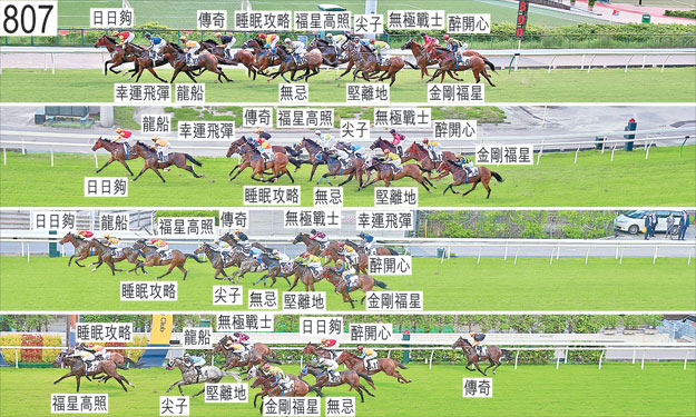「無極戰士」出閘僅屬一般,向外斜跑及碰撞「尖子」的後軀,「尖子」因而失去平衡。這導致「無極戰士」進一步失地。「無忌」於起步時向外斜跑,挨擦「龍船」。「日日夠」於躍出時失去左前蹄的蹄鐵。「醉開心」及「金剛福星」自外檔出閘後均於早段在馬群之後切入。起步後不久,「日日夠」向外斜跑及碰撞「堅離地」,當時自外檔出閘的「堅離地」收慢以圖在馬群之後切入以取得遮擋。「無忌」於早段失去右前蹄的蹄鐵。過了千三米處後,「福星高照」自己失去平衡。跟隨「福星高照」的「無極戰士」在該駒之後處於窘境之際將頭轉側及向外斜跑,因而在「尖子」的後軀內側緊迫競跑。跑過六百米處時,「傳奇」將頭轉側及內閃。趨近及跑過五百米處時,「日日夠」將頭轉側及外閃。跑過四百米處時,「福星高照」在「幸運飛彈」之後受困,當時「幸運飛彈」須受催策。跟隨其後的「無極戰士」因而靠近「福星高照」的後蹄處於窘境。在此宗事件中,「福星高照」失去右後蹄的蹄鐵。跑過三百米處時,「無極戰士」向內移入避開「幸運飛彈」的後蹄,當時「幸運飛彈」留後以望空。「堅離地」於直路上在催策下內閃。被查詢時,馬雅(「龍船」)表示,他獲指示盡可能讓坐騎在領放馬之後取得遮擋。他說,坐騎於過了千四米處後走外疊,沒有遮擋。他說,過了千二米處後賽事步速偏慢,而儘管坐騎正在搶口,但他不願讓坐騎展步上前,因為他擔心若讓坐騎上前,而居坐騎正內側的「幸運飛彈」在牠內側保持位置,將令坐騎須耗力卻未能佔取更有利的位置,繼而或未能以勁勢衝刺。他說,因此他在此情況下選擇確保坐騎取得平衡,於末段能盡其所能衝刺,但大部分途程須走外疊,沒有遮擋。小組告誡馬雅,他的解釋會被載入報告,但只要情況許可,他的騎法須避免讓坐騎不必要地多走腳程。獸醫於賽後立即檢查「幸運飛彈」,發現該駒心律不正常。「幸運飛彈」必須試閘及格,並且通過獸醫檢驗後,才可再次出賽。「無極戰士」、「福星高照」及「睡眠攻略」均須抽取樣本檢驗。