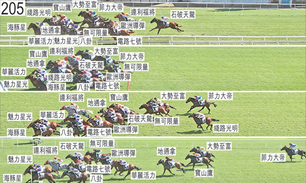 「石破天驚」出閘緩慢。「歐洲導彈」於開閘時一對前腳並舉,出閘僅屬一般。「電路七號」出閘笨拙,向內斜跑,碰撞「魅力星光」。「石破天驚」於接近七百米處時靠近「寶山鷹」的後蹄處於極大窘境,過了四百米處後於持續在「寶山鷹」之後處於窘境之際向內移入避開該駒的後蹄。「石破天驚」其後於過了三百米處後在「寶山鷹」的後蹄外側緊迫競跑之際失去平衡。過了五百米處後,「石破天驚」開始十分搶口,向內斜跑避開「寶山鷹」的後蹄。跑過四百米處時,「歐洲導彈」在被「電路七號」碰撞後失去平衡。「連利福將」於賽事較後階段在催策下外閃。跑過一百米處時,「歐洲導彈」向內移入避開「華麗活力」的後蹄,當時「華麗活力」被「電路七號」帶向內跑,而「電路七號」則被「華麗活力」碰撞後軀,繼而在催策下向內斜跑。被查詢時,巫顯東表示,他獲指示按照「八卦」的慣常跑法佔取前列位置。他說,賽前預期「海豚星」也將受催策以佔取前列位置,而他獲告知倘若該駒展現的前速較坐騎快,則佔取該駒之後有遮擋的位置也可接受。他說,坐騎出閘迅速,其後他確保坐騎能夠佔取前列位置。他說,他於賽事較早階段就注意到,「海豚星」的前速顯然較坐騎快,他認為考慮到賽事早段的步速,他將須略為催策坐騎方能保持在「海豚星」外側的位置。他說,由於策騎指示是倘若「海豚星」前速快便跟隨該駒,他遂選擇於過了七百米處後讓「海豚星」超越坐騎,並於中段跟隨該駒。他續說,趨近六百米處時,他將坐騎移至「海豚星」的內側,以圖在該駒與「魅力星光」之間推進。他說,坐騎未能充分加速取位,因而於「魅力星光」向外斜跑後在該兩駒之間無路可上。他說,坐騎其後頗為難以望空,因而未能全力施為。「八卦」的練馬師賀賢確認發給巫顯東的策騎指示。他說,「八卦」過往於早段在毋須太大力催策下佔取前列位置時表現最佳。他說,鑒於是賽的形勢,他對巫顯東決定跟隨「海豚星」而非繼續保持在該駒外側的位置感到滿意。被查詢時,薛恩表示,除了讓「無可限量」順其自然地跑外,他並未獲明確指示如何策騎坐騎。他說,坐騎於早段的前速不及排在坐騎外側檔位的「寶山鷹」快,因此他選擇讓坐騎在該駒之後切入,佔取有遮擋的位置。他說,由於他留意到「寶山鷹」上仗於末段未能以勁勢衝刺,他遂選擇繼續將坐騎向外移出以跟隨「綫路光明」,因為他認為鑒於該駒於是賽前的試閘表現,該駒將能帶領坐騎上前。他說,因此他於接近五百米處時將坐騎向外移出以跟隨「綫路光明」,跑過四百米處時坐騎靠近「綫路光明」的後蹄處於窘境,因為「綫路光明」於較他預期早得多的賽事階段受催策。他續說,坐騎其後在「綫路光明」之後受困而未能望空,過了四百米處後在「綫路光明」與「石破天驚」之間無路可上,因而須收慢,當時「綫路光明」在持續墮退之際稍微向內斜跑,而「石破天驚」則向外斜跑。他說,坐騎在「石破天驚」外側無路可上後,他於接近三百米處時將坐騎向內移入以望空。賽後,莫雷拉說,他未能就「綫路光明」於賽事較後階段轉弱提供任何解釋。他說,坐騎於早段佔取前列位置,起初走勢令人滿意,但於過了四百米處後迅速墮退。獸醫於賽後立即檢查「綫路光明」,並無發現任何明顯異常之處。獸醫於賽後立即檢查「菲力大帝」,並無發現任何明顯異常之處。「海豚星」及「魅力星光」均須抽取樣本檢驗。