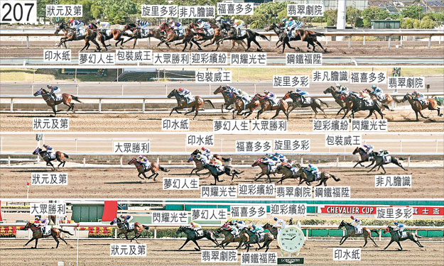 「迎彩繽紛」於躍出時在「夢幻人生」與「旋里多彩」之間受擠迫,當時「夢幻人生」碰撞「大眾勝利」,繼而向內斜跑,而「旋里多彩」則向外斜跑。「非凡膽識」出閘僅屬一般。「閃耀光芒」於起步時向外斜跑,碰撞「翡翠劇院」的後軀。其後,自外檔出閘的「翡翠劇院」儘管受催策,但未能加速,而「閃耀光芒」同時收慢以取得遮擋。自大外檔出閘的「鋼鐵福陞」儘管於早段在一段途程上受催策,但未能加速,在馬群之後切入。趨近七百米處時,「迎彩繽紛」在「旋里多彩」與「大眾勝利」之間受擠迫之際失去平衡,當時「旋里多彩」向外斜跑,而儘管騎師已盡力阻止,但「大眾勝利」仍將頭轉側及內閃。過了七百米處後,「大眾勝利」在沒有遮擋下走外疊。接近五十米處時,「夢幻人生」在催策下向外斜跑,在「閃耀光芒」的後蹄內側處於窘境。跑過終點時,「鋼鐵福陞」在「翡翠劇院」的後軀外側緊迫競跑。賽後,薛恩報告,「非凡膽識」於轉直路彎時及直路早段動作變差,其後未能展步。獸醫於賽後立即檢查「非凡膽識」,內窺鏡檢查顯示該駒的氣管內有很多痰。「非凡膽識」必須通過獸醫檢驗後,才可再次出賽。獸醫於賽後立即檢查「包裝威王」,發現該駒流鼻血。「大眾勝利」及「狀元及第」均須抽取樣本檢驗。