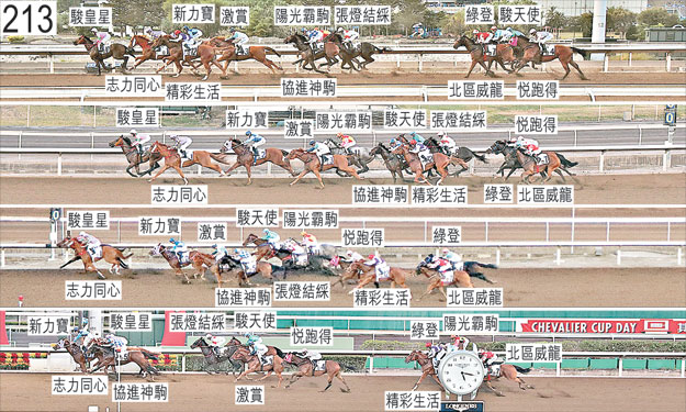 「駿天使」於開閘時一對前腳並舉,出閘緩慢。「張燈結綵」於起步時向外斜跑,碰撞「駿皇星」。「精彩生活」於躍出時向外斜跑,碰撞「綠登」。「綠登」其後於早段在馬群之後切入。自外檔出閘的「北區威龍」及「悅跑得」均於起步後不久收慢以取得遮擋。接近七百米處轉彎時,「精彩生活」向內斜跑,挨擦「志力同心」的後軀。跑過七百米處時,「駿天使」在推進至「張燈結綵」內側之際靠近該駒的後蹄處於窘境。接近六百米處時,「北區威龍」在「綠登」外側緊迫競跑,當時「綠登」將頭轉側及外閃。接近五百五十米處時,「協進神駒」推進至「精彩生活」的後蹄內側緊迫競跑。接近五百米處時,「精彩生活」稍微向內斜跑,導致「協進神駒」被帶向內跑壓向「張燈結綵」,當時「張燈結綵」一度在「駿天使」外側受擠迫。薛恩(「協進神駒」)承認一項不小心策騎〔賽事規例第100(1)條〕,事緣於接近五十米處時,他容許坐騎在催策下向內斜跑,導致「激賞」於不必要地在「協進神駒」內側受擠迫之際受阻礙。在此情況下,小組判罰薛恩由十二月十五日星期三開始停賽,直至十二月十九日星期日才可再次出賽(兩個香港賽馬日)。過了五十米處後,「駿皇星」與「志力同心」雙雙稍微斜跑,因而緊迫競跑。過了終點後,「駿皇星」及「志力同心」均在「新力寶」(周俊樂)內側受擠迫。小組就此宗事件警告周俊樂,並告誡他無論是在競賽時或賽事結束後,他均須盡全力阻止坐騎斜跑。「精彩生活」沿途走外疊,沒有遮擋。潘明輝報告,「陽光霸駒」於賽後發出異常呼吸聲。獸醫於賽後立即檢查「陽光霸駒」,並無發現任何明顯異常之處。「新力寶」及「志力同心」均須抽取樣本檢驗。
