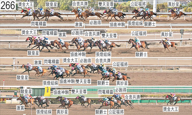 「公証福將」出閘僅屬一般。「必跑得」於起步時向外斜跑,碰撞「雙天至尊」,「雙天至尊」因而失去平衡及向內斜跑,導致「必跑得」被帶向內跑壓向「公証福將」,而「公証福將」則受妨礙。「真妙星」及「張燈結綵」自外檔出閘後均於早段在馬群之後切入。接近七百米處轉彎時,「雙天至尊」向著內欄內閃,因而失去平衡。同樣於接近七百米處轉彎時,「公証福將」被「駿爵士」挨擦,當時「駿爵士」在「張燈結綵」內側緊迫競跑。過了七百米處後,「激賞」在沒有遮擋下走外疊。趨近五百米處時,由於「駿皇星」開始移至「獎金大王」外側,因而與「閃電精靈」互相碰撞。「駿皇星」於起初未能推進至「獎金大王」外側之際靠近該駒的後蹄處於窘境。進入直路時,「駿皇星」向外斜跑,碰撞「閃電精靈」。賽後,周俊樂未能就「合衷共濟」令人失望的表現提供任何解釋。他說,坐騎於早段及中段走勢暢順,但於直路彎前及轉直路彎時須受力策,其後儘管於直路上受催策,但未能以勁勢衝刺。獸醫於賽後立即檢查「合衷共濟」,並無發現任何明顯異常之處。獸醫於賽後立即檢查「獎金大王」及「公証福將」,並無發現任何明顯異常之處。「激賞」及「駿皇星」均須抽取樣本檢驗。