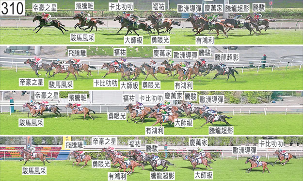 「慶萬家」與「飛騰騅」於起步時互相碰撞。「飛騰騅」繼而將頭轉側及向內斜跑,導致「慶萬家」被帶向內跑壓向「福祐」,「福祐」因而被碰撞及失去平衡。「有鴻利」於躍出時在雙雙斜跑的「帝豪之星」與「騰駿」之間受擠迫。其後,自外檔出閘的「有鴻利」及「騰駿」均收慢以取得遮擋。「騰龍超影」同樣於早段收慢及在馬群之後切入。「駿馬風采」於過了千一米處後收慢之際昂首及搶口。接近一千米處時,「帝豪之星」向內斜跑,碰撞「駿馬風采」。接近九百米處時,「卡比叻叻」向外移出避開「飛騰騅」的後蹄,並在「駿馬風采」的後蹄內側緊迫競跑,當時「駿馬風采」持續搶口。趨近及跑過九百米處時,「歐洲導彈」於收慢以取得遮擋之際數度昂首及搶口。趨近八百米處時,走勢強勁的「勇眼光」向外斜跑避開「卡比叻叻」的後蹄。跑過五百五十米處時,「歐洲導彈」靠近「勇眼光」的後蹄處於窘境。進入直路時,「大師級」被「勇眼光」碰撞,當時「勇眼光」向外移出避開「卡比叻叻」的後蹄以望空。同樣於進入直路時,「飛騰騅」向外移出避開「帝豪之星」的後蹄以圖推進至該駒與「駿馬風采」之間的窄位。其後,「駿馬風采」向內斜跑,導致「飛騰騅」在該駒與「帝豪之星」之間無路可上之際在「帝豪之星」之後處於窘境。「飛騰騅」其後頗為難以望空,趨近二百米處時移至「駿馬風采」外側。「騰駿」於趨近及跑過二百米處時頗為難以望空。「大師級」沿途走外疊,沒有遮擋。「勇眼光」、「駿馬風采」及「飛騰騅」均須抽取樣本檢驗。