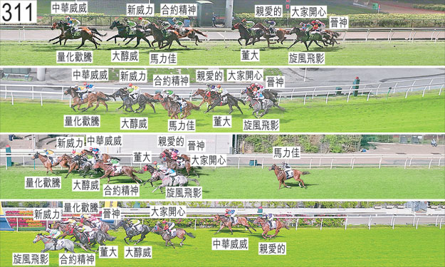 「精算其然」未能入閘,小組著令該駒退出此賽,以免賽事無理延遲開跑。小組考慮了「精算其然」嘗試入閘時的行為,著令該駒必須連續多次試閘及格後,才可再次出賽。「新威力」出閘笨拙。「旋風飛影」(莫雷拉)於起步時急促向內斜跑,碰撞「親愛的」,而「親愛的」在「旋風飛影」的後蹄內側處於窘境之際失去平衡。「旋風飛影」其後受催策,但過了千一米處後走大外疊時收慢以在馬群後列取得遮擋。趨近一千米處時,「旋風飛影」在收慢之際搶口。賽後,莫雷拉確認,賽前擬讓「旋風飛影」居於大約中間位置,但因為賽事形勢,坐騎須居於較預期為後的位置以取得遮擋。「董大」於起步時向外斜跑,在「大醇威」的後蹄內側處於窘境,「大醇威」繼而向內斜跑,導致「董大」向內斜跑避開該駒的後蹄及碰撞「馬力佳」的後軀。其後,「馬力佳」收慢避開「大醇威」的後蹄,「大醇威」繼而在跑了一段短途程後向內斜跑。「晉神」及「大家開心」自外檔出閘後均於早段在馬群之後切入。接近一千一百五十米處時,「親愛的」在「旋風飛影」與「董大」之間受擠迫之際受妨礙,當時「董大」將頭轉側及外閃。過了九百米處後,「晉神」將頭轉側及內閃避開「大家開心」的後蹄,因而靠近「親愛的」的後蹄處於極大窘境。跑過八百五十米處時,「晉神」被「大家開心」碰撞,當時「大家開心」向內斜跑,繼而被「旋風飛影」碰撞。趨近八百米處時,「馬力佳」走外疊,沒有遮擋。過了七百米處後,走勢強勁的「大醇威」在「量化歡騰」之後處於窘境。過了五百米處後,「馬力佳」將頭轉側及外閃。進入直路時,「大家開心」在「晉神」外側緊迫競跑,當時「晉神」推進至「親愛的」外側。接近二百五十米處時,「晉神」與「大家開心」一度緊迫競跑。跑過四百米處時,「董大」在「合約精神」之後處於窘境。跟隨其後的「大家開心」因而受妨礙。趨近及跑過一百米處時,「晉神」頗為難以望空。賽後,「晉神」獲報告右後腿割傷。獸醫於賽後立即檢查「馬力佳」,並無發現任何明顯異常之處。「合約精神」、「旋風飛影」及「新威力」均須抽取樣本檢驗。