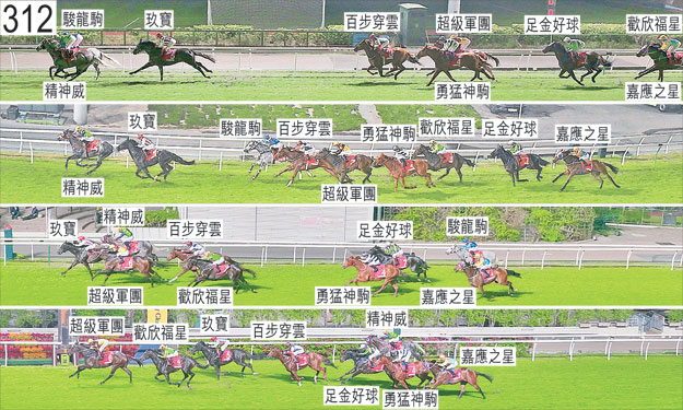 跑過千六米處時,「超級軍團」一度在「精神威」的後蹄內側緊迫競跑,當時「精神威」持續在「駿龍駒」內側處於窘境。過了千六米處後,「超級軍團」於收慢以在「勇猛神駒」之後取得遮擋之際昂首。