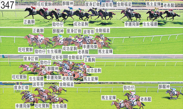 「正義駒」入閘困難,隨後包尾大敗而回。小組認為「正義駒」的表現難以接受。「正義駒」必須試閘及格,並且通過獸醫檢驗後,才可再次出賽。賽後,「正義駒」被發現發出異常呼吸聲。內窺鏡檢查證實該駒患有「喘鳴症」。「醉醒神」於起步時向外斜跑,碰撞「度身訂做」。「金剛福星」出閘僅屬一般,向外斜跑,在被「波哥哥」碰撞時失地,當時「波哥哥」向內斜跑。自外檔出閘的「老表醒」及「馬主星輝」均於早段在馬群之後切入。「幸運飛彈」於起步後不久收慢以取得遮擋。首次趨近終點時,「度身訂做」靠近「成功星駒」的後蹄處於窘境。跑過千三米處時,「成功星駒」及「醉醒神」均在「勁叻仔」的內側緊迫競跑,而「勁叻仔」則於過了千三米處後在沒有遮擋下走外疊。六百米處,「老表醒」與「幸運飛彈」互相碰撞。趨近及跑過五百米處時在一段途程上,「波哥哥」在「成功星駒」之後處於窘境之際在馬群中被帶向後,當時「成功星駒」正在墮退。跑過二百五十米處時在一段途程上,「幸運飛彈」在「生生福運」之後受困而未能望空之際靠近該駒的後蹄處於窘境。跑過二百米處時,「幸運飛彈」移至該駒「生生福運」的外側以望空。末段,「生生福運」收慢避開「幸運飛彈」(霍宏聲)的後蹄,當時「幸運飛彈」向內斜跑。「生生福運」因而未能被力策至終點。小組告誡霍宏聲,他在類似情況下須加倍小心。被查詢時,班德禮表示,「成功星駒」於早段得以佔取在「旺旺寶駒」之後的好位,其後於過了千三米處後脫口,他須開始催策坐騎以保持在「醉醒神」與「勁叻仔」之間的位置。他說,坐騎儘管於中段在一段不短的途程上受催策,但不願繼續保持位置,他於接近千一米處時須拍打坐騎肩部以圖改善坐騎走勢。他說,儘管如此,坐騎仍未能對催策交出反應,過了六百米處後須受更大力的催策。他續說,他於轉直路彎時持續催策坐騎,但坐騎毫無反應,並於直路上轉弱。獸醫於賽後立即檢查「成功星駒」,並無發現任何明顯異常之處。「成功星駒」居馬群後列過終點,小組認為該駒的表現難以接受。「成功星駒」必須試閘及格,並且通過獸醫檢驗後,才可再次出賽。賽後,潘頓表示,他未獲任何具體指示於是晚賽事如何策騎「勁叻仔」。他說,坐騎於早段須在「波哥哥」的外側走外疊,因此他於過了千六米處後催策坐騎以嘗試帶離該駒,坐騎是晚因而居於較過往為前的位置。獸醫於賽後立即檢查「勁叻仔」,並無發現任何明顯異常之處。獸醫於賽後立即檢查「醉醒神」,並無發現任何明顯異常之處。「勁叻仔」、「度身訂做」及「幸運飛彈」均須抽取樣本檢驗。