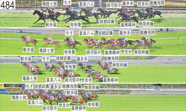 第一後備馬匹「快意」於三月七日被小組按照獸醫意見(右前腿不良於行)著令退出。「快意」必須通過獸醫檢驗後,才可再次出賽。抵達起步點後,潘頓表示對「過河勁卒」的動作有疑慮。經過必要的診視後,獸醫認為該駒適宜出賽。「贏多多」出閘僅屬一般。「超額認購」與「富高八斗」於起步時互相碰撞。「輗多福」於起步時向外斜跑,碰撞「嘭嘭聲」。「龍騰飛翔」於躍出時一對前腳並舉,向內斜跑,碰撞「無限商機」。「龍騰飛翔」繼而向外斜跑,導致「想見你」受阻礙。其後,自外檔出閘的「龍騰飛翔」及「想見你」均收慢及在馬群之後切入。接近九百五十米處時,「過河勁卒」向外斜跑,挨擦「無限商機」的後軀。「過河勁卒」其後一度在「無限商機」與「嘭嘭聲」之間的窄位競跑,當時「嘭嘭聲」向外斜跑。趨近九百五十米處時,「超額認購」在「富高八斗」與「電路七號」之間受擠迫,當時「電路七號」將頭轉側及向外斜跑。跑過六百米處時,「超額認購」在「富高八斗」的後蹄內側處於窘境。接近三百五十米處時,「富高八斗」在移至「嘭嘭聲」外側以望空之際靠近該駒的後蹄處於窘境。跑過一百米處時,「贏多多」向內移入避開「輗多福」的後蹄以繼續推進。「龍騰飛翔」於末段在「超額認購」之後受困而未能望空,因而未能被力策至終點。同樣於末段,「令才」在催策下內閃。獸醫於賽後立即檢查「嘉應精神」,內窺鏡檢查顯示該駒的氣管內有很多血。「嘉應精神」必須通過獸醫檢驗後,才可再次出賽。獸醫於賽後立即檢查「嘭嘭聲」,並無發現任何明顯異常之處。「富高八斗」、「電路七號」及「令才」均須抽取樣本檢驗。