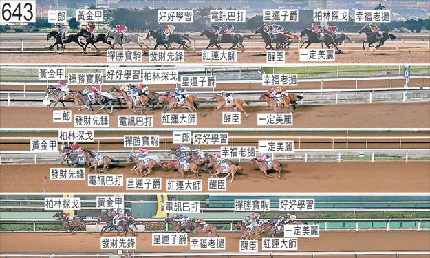 趨近二百米處時,「幸福老撾」在催策下向外斜跑,在「紅運大師」的後蹄內側處於窘境。過了一百米處後,「幸福老撾」急促向外移出避開「星運子爵」的後蹄以繼續推進。
