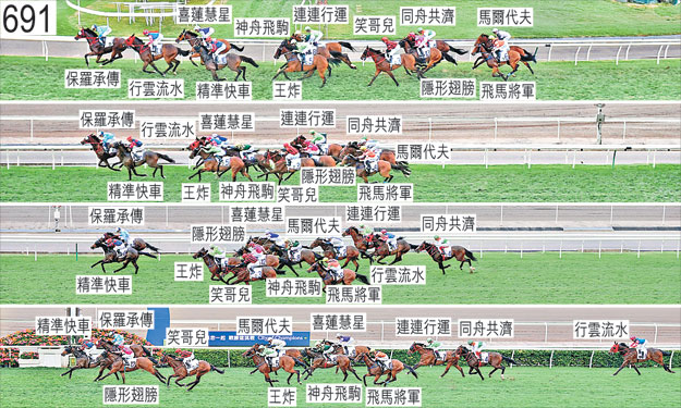 「行雲流水」於起步時向外斜跑,阻礙「神舟飛駒」。自外檔出閘的「隱形翅膀」、「飛馬將軍」及「馬爾代夫」均於早段在馬群之後切入。起步後不久,「同舟共濟」在「王炸」的後蹄外側處於窘境。接近千二米處時,「笑哥兒」在搶口之際昂首,接近一千米處時在「王炸」之後處於窘境之際再次昂首。過了千一米處後,「精準快車」於搶口及在「行雲流水」之後處於窘境之際昂首。趨近九百米處時,「精準快車」向外斜跑避開「行雲流水」的後蹄,因而在沒有遮擋下走外疊。趨近六百米處時,「馬爾代夫」開始搶口,向外移出避開「同舟共濟」的後蹄。「馬爾代夫」自入直路起受困而未能望空直至過了三百米處後。直路早段,「笑哥兒」在催策下內閃。「隱形翅膀」於直路早段頗為難以望空,接近四百米處時將頭轉側,向著「神舟飛駒」的後蹄內閃。接近二百五十米處時,「隱形翅膀」在推進至「王炸」內側的窄位之際在該駒內側處於窘境。 賽後,田泰安表示,他認為「同舟共濟」是日縮程至千六米角逐不合發揮。獸醫於賽後立即檢查「同舟共濟」,並無發現任何明顯異常之處。同樣於賽後,巴度表示,他未能就「連連行運」令人失望的表現提供任何具體理由。他說,由於賽事步速不快,他認為坐騎有機會於末段以勁勢衝刺,但坐騎未能如預期般加速,其後於末段的衝刺僅屬一般。獸醫於賽後立即檢查「連連行運」,並無發現任何明顯異常之處。「王炸」、「精準快車」及「保羅承傳」均須抽取樣本檢驗。