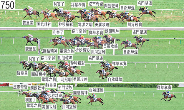 「朗朗乾坤」出閘僅屬一般。「利害了」與「祥華孝寬」於躍出時互相挨擦。「逆市奇爸」與「美麗攻略」於起步時互相碰撞。「自然輝煌」於躍出時向外斜跑,挨擦「川河冠駒」。其後,自外檔出閘的「自然輝煌」及「川河冠駒」均在馬群之後切入。起步後不久,「電源之駒」向外斜跑,碰撞「駿皇星」。趨近一千米處時,「朗朗乾坤」與「自然輝煌」互相碰撞。居「自然輝煌」外側的「川河冠駒」因而受妨礙。接近九百米處趨近彎位時,「美麗攻略」與「電源之駒」緊迫競跑。其後,「電源之駒」走大外疊,沒有遮擋。「秒秒精彩」沿途走外疊,沒有遮擋。「美麗攻略」於直路早段頗為難以望空。趨近三百米處時,「朗朗乾坤」在「逆市奇爸」之後處於窘境,當時「逆市奇爸」在「利害了」的後蹄內側緊迫競跑。接近二百五十米處時,「朗朗乾坤」移至「逆市奇爸」內側,其後嚴重受困而未能望空直至跑過一百米處。趨近二百米處時,「逆市奇爸」再次在「利害了」的後蹄內側緊迫競跑,當時「利害了」稍微向內斜跑。跑過一百米處時,「川河冠駒」被「美麗攻略」碰撞,當時「美麗攻略」推進至「川河冠駒」與「電源之駒」之間的窄位。接近終點時,正以勁勢衝刺的「名門望族」於未能在「駿皇星」與「朗朗乾坤」之間推進之際勒避,當時「朗朗乾坤」在被「名門望族」碰撞後軀後失去平衡。同樣於接近終點時,「秒秒精彩」勒避「逆市奇爸」的後蹄,因而未能被力策至終點。獸醫於賽後立即檢查「自然輝煌」,並無發現任何明顯異常之處。「美麗攻略」、「逆市奇爸」及「利害了」均須抽取樣本檢驗。