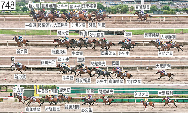 後備馬匹「齊心同行」於六月十日被小組按照獸醫意見(自從化馬場運送返港途中煩躁不安)著令退出。「齊心同行」必須通過獸醫檢驗後,才可再次出賽。「駿天使」及「閃電」出閘均僅屬一般。「文明之星」與「牛皇頭」於躍出時互相挨擦。起步後不久,「駿天使」向外斜跑及碰撞「好玩福星」,「好玩福星」其後在「駿天使」外側處於窘境時昂首,當時「駿天使」被「龍騰飛翔」稍微帶向外跑。趨近及跑過八百米處時,「大眾勝利」(莫雷拉)在將頭轉側及內閃後失地,導致「必先生」在「大眾勝利」內側及「好玩福星」外側緊迫競跑,當時「好玩福星」受催策以在「必先生」與「駿天使」之間保持位置。在「大眾勝利」內閃時,「閃耀榮光」切入佔取出現的空位。接近七百米處轉彎時,持續內閃的「大眾勝利」因被「必先生」帶向外跑橫越稍微向內斜跑的「閃耀榮光」的後蹄而大力勒避,當時「必先生」相應被「好玩福星」帶向外跑,而「好玩福星」則因「駿天使」於轉彎時走勢笨拙及稍微向外斜跑而失去平衡及碰撞「必先生」。在此宗事件中,「必先生」在「好玩福星」與「閃耀榮光」之間受擠迫之際也嚴重受阻礙。小組認為,儘管此宗事件具有一定程度的影響,但主要是由「大眾勝利」的走勢,加上該駒內側的馬匹向外斜跑所造成,因此不採取進一步行動。在「大眾勝利」勒避時,「文明之星」勒避並自該駒之後向外移出以避開。「閃電」因而也受阻礙。賽後,莫雷拉報告,他認為「大眾勝利」於直路上未能上前,是由此宗事件直接造成,因為坐騎在賽事關鍵時刻須大力勒避後未能恢復走勢。獸醫於賽後立即檢查「大眾勝利」,並無發現任何明顯異常之處。「旌鷹」自入直路起嚴重受困而未能望空直至過了一百米處後,接近終點時在「牛皇頭」內側緊迫競跑,因而未能全力施為。接近三百米處時,「旌鷹」在「龍騰飛翔」之後受困而未能望空之際嚴重失去平衡。「閃耀榮光」沿途走外疊,沒有遮擋。獸醫於賽後立即檢查「閃電」,並無發現任何明顯異常之處。「大眾勝利」、「新力寶」及「喜蓮慧星」均須抽取樣本檢驗。