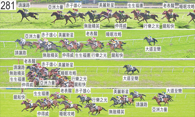 「赤子雄心」於躍出時在雙雙斜跑的「請讓路」與「無敵精英」之間受擠迫。「大道至簡」在閘內煩躁不安,躍出時被向內斜跑的「睡眠攻略」碰撞。其後,自外檔出閘的「大道至簡」及「睡眠攻略」均於早段在馬群之後切入以取得遮擋。「老表醒」於起步後不久收慢以佔取較接近內欄的位置。過了千六米處後,「赤子雄心」與「無敵精英」互相碰撞。跑過千二米處時,「老表醒」一度在「龍船快」內側受擠迫,當時「龍船快」將頭轉側及向內斜跑,繼而向外移出以紓緩擠迫。跟隨「龍船快」的「睡眠攻略」因而受妨礙。「請讓路」於中段在領放下搶口。跑過三百米處時,「美麗新星」在「赤子雄心」與「亞洲力量」之間無路可上之際受妨礙,當時「赤子雄心」向外斜跑,而「亞洲力量」則被「無敵精英」稍微帶向內跑。過了三百米處後,「生生福運」在推進至「無敵精英」與「仲得威」之間的窄位之際與「仲得威」互相碰撞。跑過二百五十米處時,「睡眠攻略」向外移出橫越「仲得威」的後蹄以望空。「睡眠攻略」在向外移出時挨擦「行樂之光」。趨近一百米處時,「睡眠攻略」在雙雙斜跑的「龍船快」與「仲得威」之間受擠迫之際受妨礙。被查詢有關「無敵精英」令人失望的表現時,潘頓表示,坐騎是晚賽事增程跑回千八米,他認為賽事步速不適合坐騎發揮。他說,他認為坐騎須在較是晚賽事更為緩慢的步速下競逐,方能以強勁走勢應付千八米途程。獸醫於賽後立即檢查「無敵精英」,並無發現任何明顯異常之處。賽後,蘇兆輝報告,「亞洲力量」是晚賽事於早段佔取前列位置,其後全程走勢欠強勁。他說,坐騎於過了八百米處後須受力策,其後於末段未能以勁勢衝刺。獸醫於賽後立即檢查「亞洲力量」,並無發現任何明顯異常之處。賽後,獸醫應練馬師容天鵬的要求替「仲得威」進行內窺鏡檢查。獸醫表示,是項檢查顯示該駒的氣管內有很多血。「仲得威」必須通過獸醫檢驗後,才可再次出賽。獸醫於賽後立即檢查「美麗新星」,並無發現任何明顯異常之處。「無敵精英」、「龍船快」及「仲得威」均須抽取樣本檢驗。