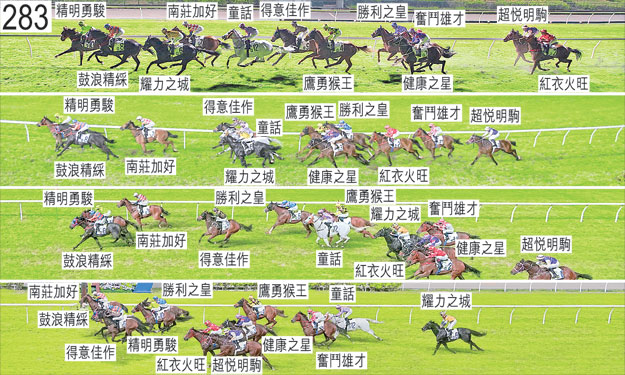 「童話」在運往跑馬地馬場途中左後蹄球節擦傷,其後接受獸醫檢查,獸醫認為該駒適宜出賽。「勝利之皇」自外檔出閘僅屬一般,其後在馬群之後切入以取得遮擋。「得意佳作」出閘十分笨拙,向外斜跑,碰撞「鷹勇猴王」的後軀,「鷹勇猴王」因而嚴重失去平衡。「得意佳作」繼而在「童話」外側受擠迫,當時「童話」將頭轉側及向外斜跑。「鷹勇猴王」於起步後不久在因被「得意佳作」碰撞而失去平衡之際向外斜跑,碰撞「健康之星」,當時「健康之星」在「奮鬥雄才」內側緊迫競跑,而「奮鬥雄才」則於躍出時被「超悅明駒」碰撞。在此宗事件中,「鷹勇猴王」及「健康之星」均嚴重失去平衡。「健康之星」其後向外斜跑,碰撞「奮鬥雄才」。其後,「超悅明駒」收慢以取得遮擋。起步後跑了一段短途程後,「精明勇駿」向外斜跑,碰撞「南莊加好」。趨近千一米處時,「奮鬥雄才」在收慢以取得遮擋之際在「健康之星」外側緊迫競跑。趨近及跑過八百米處時,「紅衣火旺」開始十分搶口,過了八百米處後在靠近「奮鬥雄才」的後蹄處於極大窘境之際向外斜跑避開該駒的後蹄。六百米處轉彎時,「鷹勇猴王」向外斜跑,碰撞「健康之星」。趨近五百米處時,「勝利之皇」在「鷹勇猴王」內側的窄位競跑。接近終點時,「勝利之皇」外閃,在「精明勇駿」內側緊迫競跑。「耀力之城」沿途走外疊,沒有遮擋。被查詢時,霍宏聲表示,他獲指示是晚將「健康之星」置於盡量靠前的位置。他說,坐騎於起步時受阻礙,他其後遵照策騎指示催策坐騎,坐騎起初對催策交出反應,他曾希望坐騎於過了千一米處後能夠展現足夠前速超越「童話」。他說,坐騎於接近一千零五十米處轉彎時自己失去平衡及失去步韻,因而儘管持續受催策,但仍失地。他說,這導致坐騎須走第三疊,但有遮擋,並居較他所願般為後的位置。他續說,他於過了七百米處後催策坐騎以保持位置,坐騎於轉直路彎時受力策,考慮到坐騎陣上的走勢,牠其後於直路上的衝刺令人滿意。他說,是晚僅第二次上陣的「健康之星」十分稚嫩,日後將受惠於出賽經驗增加。獸醫於賽後立即檢查「健康之星」,並無發現任何明顯異常之處。「南莊加好」及「鼓浪精綵」均須抽取樣本檢驗。
