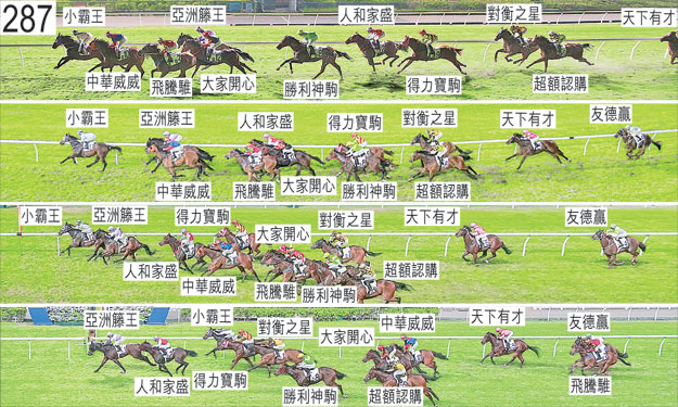 「超額認購」於躍出時向外斜跑,阻礙「友德贏」。其後,自外檔出閘的「超額認購」及「友德贏」均在馬群之後切入。
