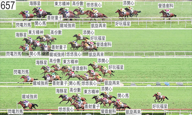 「至旺財」於五月十二日被小組按照獸醫意見(右前腿不良於行)著令退出。「至旺財」必須通過獸醫檢驗後,才可再次出賽。「營造創科」於開閘時以後足豎立,導致騎師艾道拿嚴重失去平衡,而「營造創科」則失地。「營造創科」必須試閘及格後,才可再次出賽。「高份數」出閘緩慢。「好玩福星」出閘僅屬一般。起步後不久,「添開心」受「悠悠我心」擠迫,當時「悠悠我心」被向外斜跑的「海豚星」帶向外跑。布文(「悠悠我心」)承認一項不小心策騎〔賽事規例第100(1)條〕,事緣於接近一百五十米處時,他容許坐騎在尚未帶離「凱旋再來」下向外斜跑,導致該駒在受「悠悠我心」擠迫之際失去應有的跑線。小組判罰布文由五月二十一日星期日開始停賽,直至五月二十五日星期四才可再次出賽(兩個香港賽馬日)。在衡量判罰輕重時,小組考慮了布文的良好策騎紀錄。接近一百米處時,傾向外閃的「營造創科」向外斜跑及碰撞「開心馬」。賽後,周俊樂(「添開心」)報告,坐騎未能適應是日的場地狀況。獸醫於賽後立即檢查「添開心」,並無發現任何明顯異常之處。同樣於賽後, 班德禮(「高份數」)報告,坐騎沿途外閃,末段在靠近「海豚星」的後蹄競跑之際未能被力策至終點。獸醫於賽後立即檢查「好玩福星」,並無發現任何明顯異常之處。獸醫於賽後立即檢查「營造創科」,發現該駒患有「喘鳴症」,而該駒過往也有此毛病報告。「善財童子」、「閃電烈馬」及「龍城強將」均須抽取樣本檢驗。