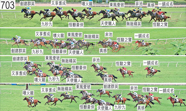 「東風壹號」於起步時向外斜跑,與「怪獸豪俠」互相大力碰撞,因而失去平衡。在此宗事件中,「怪獸豪俠」被帶向外跑,導致「九秒九」在 「怪獸豪俠」與向內斜跑的「創建群英」之間受擠迫。「非池」出閘笨拙。「恆駿之寶」自外檔出閘僅屬一般,於早段在馬群之後切入。自大外檔出閘的「一舖成名」同樣於早段在馬群之後切入。趨近千五米處時,「怪獸豪俠」收慢避開 「又享耆成」(梁家俊),當時「又享耆成」在尚未充分帶離之際向內移入。小組譴責梁家俊。「真感」於過了六百米處後在「恆駿之寶」內側緊迫競跑之際與該駒互相碰撞。「九秒九」於趨近二百五十米處時向外斜跑避開「又享耆成」,因而與「噴火龍」互相碰撞,接近一百五十米處時在墮退之際向外斜跑擠壓「怪獸豪俠」,其後被騎師嘉里修正。在此宗事件中,「怪獸豪俠」向外斜跑,挨擦「天使獵人」。賽後,潘頓(「天使獵人」)報告,他於趨近七百米處時在「恆駿之寶」推進至坐騎外側之際須讓坐騎提早發力。他又說,坐騎因而其後須在沒有遮擋下走外疊,難以於末段以勁勢衝刺。獸醫於賽後立即檢查「天使獵人」 ,並無發現任何明顯異常之處。同樣於賽後,蔡明紹(「恆駿之寶」)表示,他讓坐騎在對面直路上上前,坐騎其後被向外移出的「天使獵人」帶向外跑,導致他須停止讓坐騎上前及於接近六百米處時佔取「天使獵人」之後的位置。他又說,坐騎在直路上受催策,衝刺僅屬一般。獸醫於賽後立即檢查「恆駿之寶」,並無發現任何明顯異常之處。獸醫於賽後立即檢查「真感」,並無發現任何明顯異常之處。「天使獵人」、「噴火龍」及「又享耆成」均須抽取樣本檢驗。