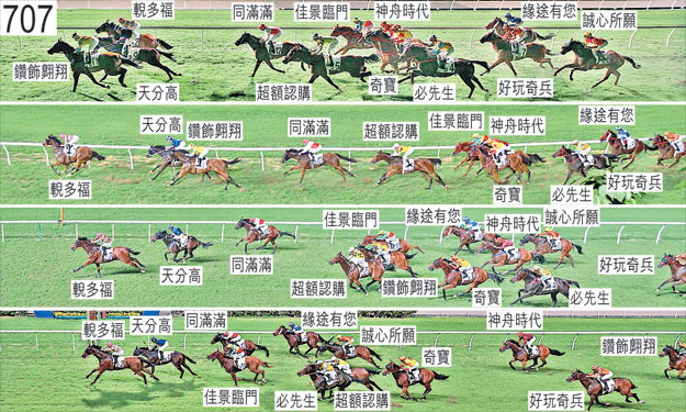 「超額認購」於躍出時被向內斜跑「天分高」碰撞,因而向內斜跑及與「奇寶」互相碰撞。「好玩奇兵」自外檔躍出時同樣向內斜跑,觸碰「天分高」的後軀。其後,「好玩奇兵」於早段在馬群之後切入,傾向內閃,接近八百米處時收慢避開「奇寶」,並於中段沿途持續內閃。自大外檔出閘的「誠心所願」同樣於早段在馬群之後切入。接近終點時,「奇寶」在「超額認購」與向內斜跑的「必先生」之間受擠迫之際未能被力策。賽後,潘頓(「奇寶」)報告,坐騎大部分途程上須走外疊,負頂磅下難以於末段以勁勢衝刺。獸醫於賽後立即檢查「奇寶」,並無發現任何明顯異常之處。被查詢時,巴度(「緣途有您」)表示,坐騎於閘內煩躁不安,其後出閘笨拙,觸碰閘廂左側。他說,儘管他已催策坐騎,但坐騎在賽事早段的快步速下未能展現足夠前速以保持居於較為靠前的位置,因而居於馬群後列。他又說,他在中段沿途試圖鼓勵坐騎上前,但由於步速快,坐騎在受催策上前之際失去平衡,因此,他須於中段留住坐騎。他進一步表示,他能夠於入直路時催策坐騎,坐騎衝刺僅屬一般。他說,他認為坐騎增程角逐並留後競跑將更適合發揮,而在沙田上陣同樣將更適合發揮。獸醫於賽後立即檢查「緣途有您」,並無發現任何明顯異常之處。獸醫於賽後立即檢查「好玩奇兵」,並無發現任何明顯異常之處。「輗多福」及「天分高」均須抽取樣本檢驗。