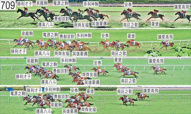 同樣於起步後不久,「多利神駒」在內閃的「勇創派對」內側緊迫競跑。