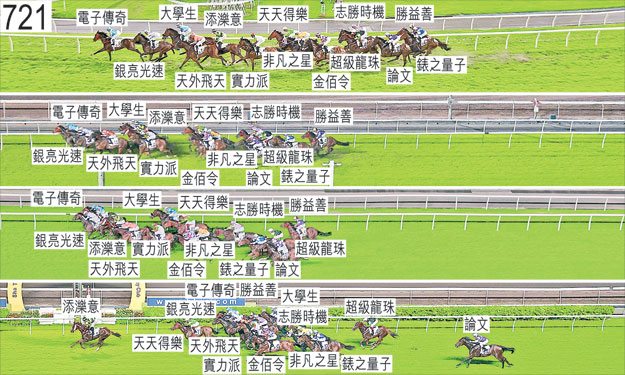 「添濼意」於起步時向內斜跑,碰撞「大學生」。「非凡之星」出閘笨拙。「天天得樂」自外檔出閘緩慢,其後於早段在馬群之後切入。「勝益善」自外檔出閘後同樣於早段在馬群之後切入。起步後不久,「志勝時機」在「非凡之星」與「超級龍珠」(布文)之間受擠迫,當時「超級龍珠」向內斜跑及擠壓「志勝時機」,繼而在「錶之量子」(見習騎師鍾易禮)向內斜跑之際未能紓緩擠迫。小組告誡布文及見習騎師鍾易禮均須加倍小心。「大學生」於早段搶口。「論文」於早段搶口,接近千二米處時在收慢避開「金佰令」之際向內斜跑,導致「超級龍珠」擠壓「志勝時機」。「志勝時機」其後於中段搶口。「添濼意」於直路早段受困而未能望空,接近三百米處時推進至「銀亮光速」外側,其後在一段短途程上在「天外飛天」向內斜跑之際在該駒內側緊迫競跑,因而與「天外飛天」互相觸碰。因此,「天外飛天」其後向外斜跑,並且將「實力派」略為帶向外跑。「天天得樂」於四百米處至二百五十米處之間在「添濼意」之後受困而未能望空。「勝益善」於轉直路彎時受困,於末段移至「銀亮光速」外側以繼續望空。接近二百米處時,「錶之量子」在被「金佰令」帶向外跑之際受妨礙,當時「金佰令」向外斜跑避開「非凡之星」。「天外飛天」大部分途程走外疊,沒有遮擋。被查詢時,潘頓(「志勝時機」)表示,坐騎於早段受擠迫,其後居於較預期為後的位置。他續說,坐騎於進入直路時一度在「天天得樂」與「非凡之星」之間受困,繼而於接近三百米處時望空,其後他開始催策坐騎。他說,坐騎於接近二百米處時在「實力派」被帶向外跑之際在該駒外側無路可上,其後移回至該駒內側,於最後一百米處居於「天天得樂」之後,他因而未能全力催策坐騎。獸醫於賽後立即檢查「志勝時機」,並無發現任何明顯異常之處。賽後,布文(「超級龍珠」)報告,坐騎於直路上未能充分展步,他對坐騎後肢的動作有些疑慮。獸醫於賽後立即檢查「超級龍珠」,並無發現任何明顯異常之處。「超級龍珠」必須通過獸醫檢驗後,才可再次出賽。同樣於賽後,希威森(「非凡之星」)報告,他賽前打算將坐騎保持居前列位置,但「添濼意」於早段展現較快前速,坐騎因而須留居於該駒之後。他續說,坐騎於直路上在催策下走勢僅屬一般。獸醫於賽後立即檢查「非凡之星」,並無發現任何明顯異常之處。「志勝時機」、「添濼意」及「天天得樂」均須抽取樣本檢驗。