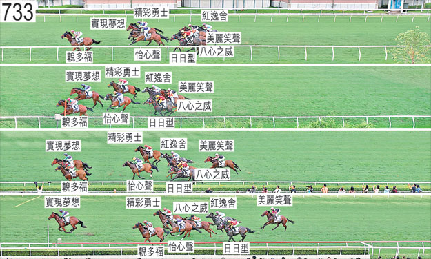「美麗笑聲」出閘笨拙,與「紅逸舍」互相觸碰。「八心之威」及「精彩勇士」均同樣出閘笨拙。「日日型」出閘僅屬一般。「紅逸舍」於最後四百米在催策下外閃。接近二百五十米處時,「八心之威」在雙雙略為斜跑的「日日型」與「怡心聲」之間緊迫競跑。「八心之威」繼而於接近一百五十米處時移至「怡心聲」內側以望空。獸醫於賽後立即檢查「日日型」、「美麗笑聲」及「紅逸舍」,並無發現任何明顯異常之處。「實現夢想」及「輗多福」均須抽取樣本檢驗。