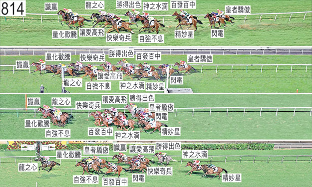 「百發百中」在配鞍房內校正左前蹄的蹄鐵,抵達起步點後接受獸醫檢查,獸醫認為該駒適宜出賽。「閃電」於入閘後煩躁不安。「閃電」必須經閘廂測試及格後,才可再次出賽。「百發百中」及「精妙星」出閘均僅屬一般。「皇者驕傲」及「閃電」自外檔出閘後均於早段在馬群之後切入。接近一千米處時,首次在港上陣的「精妙星」開始搶口。趨近九百米處時,「精妙星」在「神之水滴」(巴度)收慢及向內移入以佔取「讓愛高飛」之後的位置後勒避「神之水滴」,因而開始搶口,並且昂首及向外移出橫越「自強不息」的後蹄,繼而再度勒避。小組譴責巴度。「閃電」因而在「精妙星」向內移回之前的位置之際收慢。「百發百中」及「神之水滴」均於中段搶口。「閃電」於接近三百米處時頗為難以望空。接近二百米處時,「自強不息」略為向內斜跑,與「量化歡騰」互相觸碰。小組就陳嘉熙於轉直路彎時及直路上策騎「皇者驕傲」的方式展開研訊。小組聽取了陳嘉熙及「皇者驕傲」的練馬師方嘉柏的證供。陳嘉熙告知小組,「皇者驕傲」是賽由一千六百五十米途程縮程角逐一千二百米賽事,他賽前預期坐騎自外檔出閘後須留居馬群後列,但他並無獲發關於坐騎於直路上的具體位置的指示。他說,坐騎居於馬群後列,他曾考慮於轉直路彎時將坐騎移至「閃電」的外側以跟隨「精妙星」,然而他不選擇這樣做,因為他覺得他或須略為收慢坐騎以繞過「閃電」的後蹄。他續說,他因而於入直路時讓坐騎推進至內疊,其後能夠催策坐騎。他說,坐騎於接近三百米處時居於「讓愛高飛」之後時,他專注於讓坐騎跟隨是賽大熱門「龍之心」,但他不願讓坐騎推進至「讓愛高飛」內側及力策坐騎,因為他擔心「讓愛高飛」或會向內移入,坐騎或會過於靠近該駒的後蹄。他進一步表示,坐騎因而持續居於「讓愛高飛」之後競跑,繼而移至該駒的外側,但於二百五十米處至一百五十米處之間受困及未能被力策。他說,坐騎其後於該處望空後隨即以勁勢衝刺。方嘉柏確認他發出的策騎指示,並且表示對陳嘉熙的騎法感到滿意。小組押後研訊至另訂日期進行。「快樂奇兵」大部分途程須在沒有遮擋下走外疊。獸醫於賽後立即檢查「快樂奇兵」,並無發現任何明顯異常之處。獸醫於賽後立即檢查「識贏」及「神之水滴」,並無發現任何明顯異常之處。「龍之心」及「自強不息」均須抽取樣本檢驗。