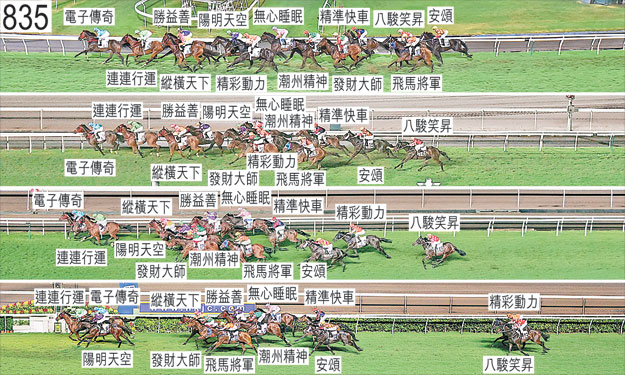接近千二米處時,「連連行運」收慢避開「陽明天空」,因而向外斜跑,將「縱橫天下」帶出較外疊。「縱橫天下」其後在沒有遮擋下走外疊。