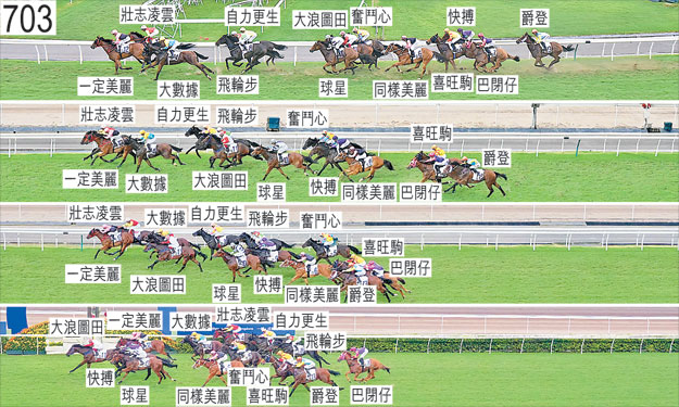 | 「喜旺駒」躍出時受「大浪圖田」擠迫,當時「大浪圖田」在與「球星」互相碰撞後向內斜跑。接近三百五十米處時發生碰撞。賽後,何澤堯報告,坐騎自七百米處起受催策,直路上未能追前。賽後立即接受獸醫檢查,並無發現任何明顯異常之處。 「壯志凌雲」賽後,田泰安報告,坐騎在領放時受「一定美麗」追迫下不合發揮,因而在直路上衝刺乏力。賽後立即接受獸醫檢查,並無發現任何明顯異常之處。賽後須抽取樣本檢驗。 「奮鬥心」出閘僅屬一般,其後不久受擠迫。 「同樣美麗」起步時向內斜跑及被碰撞。 「巴閉仔」自外檔出閘後於早段在馬群之後切入。接近三百五十米處時在「爵登」與「喜旺駒」之間受擠迫之際失去平衡,當時「喜旺駒」向外移出以推進。賽後,希威森表示,他認為首次佩戴眼罩上陣的坐騎在加戴這項配備下不合發揮。賽後立即接受獸醫檢查,並無發現任何明顯異常之處。 「飛輪步」賽後,潘頓表示,由於賽事中段步速較標準時間略快,坐騎走勢欠強勁。賽後立即接受獸醫檢查,發現此駒患有「喘鳴症」,而此駒過往也有此毛病報告。 「快搏」自外檔出閘後於早段在馬群之後切入。賽後須抽取樣本檢驗。 「球星」躍出時被向內斜跑的「同樣美麗」碰撞。 「大浪圖田」起步後不久發生碰撞。被查詢有關此駒表現有所進步時,練馬師丁冠豪表示,此駒於三月三十一日一仗在較乾快的場地上更適合發揮。他說,此駒上仗自外檔出閘後,騎師霍宏聲須加以催策以讓坐騎佔取前列位置,因而於直路上衝刺乏力。他又說,因此,他曾預期是日受惠於居於中間位置競跑的此駒將於末段以佳勢衝刺。賽後須抽取樣本檢驗。 「爵登」接近三百五十米處時發生碰撞。賽後,班德禮表示,儘管他賽前打算讓坐騎自外檔出閘後於早段留後競跑,但坐騎於早段走外疊,他須約束坐騎以居於馬群後列競跑,以免坐騎繼續走外疊。 「大數據」大部分途程在沒有遮擋下走外疊。 「馬林」不願入閘,被小組著令退出此賽。小組裁定「馬林」必須連續兩次試閘及格,而其中一次試閘必須在香港進行後,才可再次出賽。