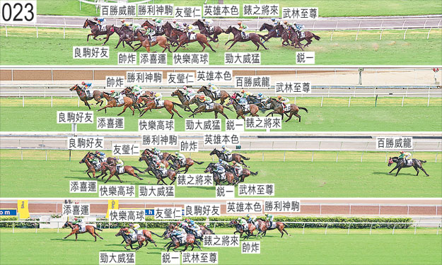 「快樂高球」起步後不久被向外斜跑的「帥炸」碰撞,因而被帶出較外疊。 「友瑩仁」接近千二米處時在被「百勝威龍」(希威森)過頭之際收慢避開該駒的後蹄。小組告誡希威森在轉換跑線時須確保已充分帶離。被查詢時,潘頓表示,坐騎早段及中段沿途搶口,不願穩定走勢,因而於接近一千米處時在一段途程上須勒避「百勝威龍」的後蹄。他說,坐騎因而在直路上對催策未能交出強勁反應。他進一步表示,他向馬主及練馬師建議此駒下仗縮程角逐,讓牠有機會在較快的步速下穩定走勢。練馬師伍鵬志表示,儘管此駒是日除去頭罩上陣,但他認為此駒是日的表現可歸因於此駒在充滿新鮮感下作季內首仗。他說,考慮了潘頓的意見後,他將會尋求讓此駒下仗縮程角逐。賽後須抽取樣本檢驗。 「錶之將來」出閘僅屬一般。趨近四百米處時在「百勝威龍」開始墮退及略為向外斜跑之際收慢避開該駒。 「英雄本色」轉直路彎時在「友瑩仁」內側緊迫競跑。 「帥炸」起步時向外斜跑及被碰撞。賽後,艾兆禮表示,儘管坐騎大部分途程須在沒有遮擋下走外疊,但應能從是日季內首仗中獲益。賽後立即接受獸醫檢查,並無發現任何明顯異常之處。 「勁大威猛」自外檔出閘笨拙,其後於早段在馬群之後切入。賽後須抽取樣本檢驗。 「百勝威龍」賽後,希威森報告,坐騎於轉直路彎時失去平衡,直路上顯著墮退。賽後立即接受獸醫檢查,並無發現任何明顯異常之處。「百勝威龍」連續第二次包尾大敗而回,小組認為此駒的表現難以接受。「百勝威龍」必須連續多次試閘及格,並且通過包括額外診斷評估的獸醫檢驗後,才可再次出賽。 「勝利神駒」賽後,潘明輝報告,坐騎在收停時咳嗽。賽後立即接受獸醫檢查,內窺鏡檢查顯示此駒的氣管內有很多血。「勝利神駒」必須通過獸醫檢驗後,才可再次出賽。 「良駒好友」賽後,梁家俊表示,賽前未有打算讓坐騎領放,但當其他馬匹無意領前時,坐騎在毋須受催策下得以領放。 「添喜運」大部分途程在沒有遮擋下走大外疊。賽後,鍾易禮報告,他的馬鞍於陣上向右滑移,令他陷入略為不利的處境。被查詢有關此駒的進步表現時,練馬師伍鵬志表示,賽前打算讓此駒嘗試跟隨領放馬。他說,他認為此駒的進步表現可歸因於牠今季更趨成熟,他對此駒賽前試閘的表現感到滿意。賽後須抽取樣本檢驗。