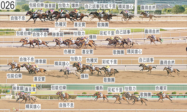 「喜至寶」賽後須抽取樣本檢驗。 「精英雄心」自外檔出閘後於早段在馬群之後切入。賽後須抽取樣本檢驗。 「勝意龍」賽後須抽取樣本檢驗。 「贏得自然」自大外檔出閘後於早段在馬群之後切入。 「色種笑」在閘內煩躁不安,出閘僅屬一般,其後被「喜至寶」碰撞。直路上內閃,導致巴度於接近二百五十米處時改以右手握鞭之際頗為難以這樣做。巴度於跑過二百米處時跌掉馬鞭。大部分途程走外疊,沒有遮擋。賽後,巴度報告,由於坐騎在閘內煩躁不安,他於接近八百米處趨近首個彎位時須校正右腳在腳踏內的位置。賽後立即接受獸醫檢查,並無發現任何明顯異常之處。