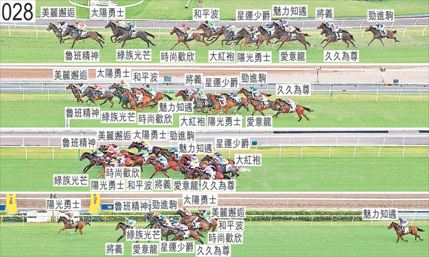 「魅力知遇」見習騎師黃寶妮(「大紅袍」)承認一項不小心策騎〔賽事規例第100(1)條〕,事緣於趨近一千二百五十米處時,她容許坐騎在尚未帶離「太陽勇士」下向內斜跑,令「太陽勇士」被帶向內跑壓向「和平波」,導致「和平波」被帶向內跑橫越「魅力知遇」的跑線,「魅力知遇」因而勒避。小組裁定見習騎師黃寶妮的不小心策騎程度屬第二級,以及影響情況屬第二級,也考慮了她的極佳策騎出賽紀錄。考慮了有關判罰的陳辭,以及見習騎師黃寶妮在港策騎經驗尚淺,小組嚴厲譴責她。賽後立即接受獸醫檢查,並無發現任何明顯異常之處。 「陽光勇士」自九百米處起在沒有遮擋下走外疊。接近一百七十米處時跳越草地跑道上顏色稍異之處。賽後須抽取樣本檢驗。 「久久為尊」出閘僅屬一般。 「美麗邂逅」起步時被碰撞後軀。 「將義」自外檔出閘笨拙,與「美麗邂逅」互相觸碰,其後於早段在馬群之後切入。賽後須抽取樣本檢驗。 「大紅袍」接近二百米處時踢中「魅力知遇」的後蹄及失蹄,當時正在內閃的「魅力知遇」收慢避開略為向外斜跑的「將義」(艾道拿)。小組告誡艾道拿須加倍小心。在衡量此宗事件時,小組也確認此駒正在內閃,令見習騎師黃寶妮未能將坐騎向外移出避開「魅力知遇」。見習騎師黃寶妮因於趨近一千二百五十米處時造成干擾而承認一項不小心策騎。(見「魅力知遇」)。賽後立即接受獸醫檢查,並無發現任何明顯異常之處。 「和平波」出閘僅屬一般。趨近三百米處時在「魯班精神」與略為向內斜跑的「綠族光芒」之間的窄位競跑。 「星運少爵」四百米處至二百五十米處之間受困而未能望空。 「勁進駒」接近一百五十米處時在推進至「美麗邂逅」與「魯班精神」之間的窄位時難以望空。 「愛意龍」賽後被發現口內有血。