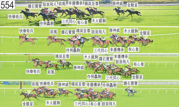 「幸運傳承」接近六百米處時勒避「鼓浪飛凡」。趨近二百米處時在一段途程上在「伶俐驫駒」之後受困而未能望空,接近二百米處時在「伶俐驫駒」外側未能望空之際勒避,與「鼓浪飛凡」互相觸碰。 「鑽石寶寶」湯普新因於接近六百米處時造成干擾而承認一項不小心策騎(見「鼓浪飛凡」)。賽後立即接受獸醫檢查,內窺鏡檢查顯示此駒的氣管內有很多血。「鑽石寶寶」必須通過獸醫檢驗後,才可再次出賽。 「金駿星」自大外檔出閘後於早段在馬群之後切入。賽後須抽取樣本檢驗。 「鼓浪飛凡」湯普新(「鑽石寶寶」)承認一項不小心策騎〔賽事規例第100(1)條〕,事緣於接近六百米處時,他容許坐騎在尚未帶離「鼓浪飛凡」下向內斜跑,導致「鼓浪飛凡」須收慢,而跟隨其後的「幸運傳承」及「木火龍駒」均須勒避。小組判罰湯普新由四月二十七日星期日開始停賽,直至五月一日星期四才可再次出賽(兩個香港賽馬日)。在衡量判罰輕重時,小組裁定湯普新的不小心策騎程度屬第二級,以及影響情況屬第二級,也考慮了他的良好策騎出賽紀錄。趨近二百米處時在「三代同心」與「幸運傳承」(霍宏聲)之間受擠迫,當時「三代同心」略為向內斜跑,而「幸運傳承」則移至「伶俐驫駒」外側,而該處空位不足以這樣做。小組嚴厲譴責霍宏聲,並告誡他在推進至空位時須確保該處有足夠的競賽空間。 「精英至尊」自外檔出閘僅屬一般,早段在馬群之後切入。潘頓因於趨近一千米處時造成干擾而被裁定一項不小心策騎(見「勝神威」)。賽後立即接受獸醫檢查,發現此駒右後腿的表皮有一處大傷口。 「有心意」被查詢時,班德禮表示,坐騎於早段佔取前列位置,他在坐騎走外疊之際消耗坐騎氣力以嘗試讓牠上前。他說,坐騎未能超越內側馬匹,他遂選擇於接近一千米處轉彎時約束坐騎以佔取有遮擋的位置。被查詢有關他於轉直路彎時及直路早段的騎法,以及是否有機會將坐騎推進至「三代同心」外側時,班德禮表示,鑒於早段持續消耗氣力,坐騎於直路彎不願繞過對手推進上前,因而保持在「三代同心」之後競跑。他又說,「三代同心」於趨近直路時向外斜跑,其後他嘗試讓坐騎在「三代同心」內側與「鼓浪飛凡」外側望空。他說,當該空位消失時,坐騎於三百米處至一百五十米處之間受困而未能望空。班德禮同意小組的看法,即他於直路彎未有將坐騎移至「三代同心」外側以望空屬判斷錯誤。 「三代同心」趨近一千米處時在「鑽石寶寶」與「快樂奇兵」之間的窄位競跑之際收慢,當時「鑽石寶寶」在「伶俐驫駒」內側緊迫競跑,而「快樂奇兵」則略為向外斜跑。 「勝神威」潘頓(「精英至尊」)被裁定一項不小心策騎〔賽事規例第100(1)條〕,事緣於趨近一千米處時,他在坐騎尚未帶離「勝神威」下將坐騎向內移入,導致坐騎與「勝神威」互相觸碰,而「勝神威」則在受擠迫之際失去平衡,並於跑了一段短途程後在失去應有的跑線之際須勒避。小組判罰潘頓於四月九日星期三跑馬地賽事停賽(一個香港賽馬日)。在衡量判罰輕重時,小組裁定潘頓的不小心策騎程度屬第二級,以及影響情況屬第二級,也考慮了他的極佳策騎出賽紀錄。跑離五百米處時在受「木火龍駒」擠迫之際收慢,當時「木火龍駒」在勒避「幸運傳承」之際向內斜跑。賽後須抽取樣本檢驗。 「伶俐驫駒」大部分途程在沒有遮擋下走外疊。賽後立即接受獸醫檢查,並無發現任何明顯異常之處。 「木火龍駒」接近六百米處時勒避「幸運傳承」,因而開始搶口,並推進至「幸運傳承」內側,其後在該駒內側的窄位競跑。 「前風」趨近一千米處轉彎時向內斜跑及挨擦內欄。接近六百米處時內閃及挨擦內欄。賽後須抽取樣本檢驗。