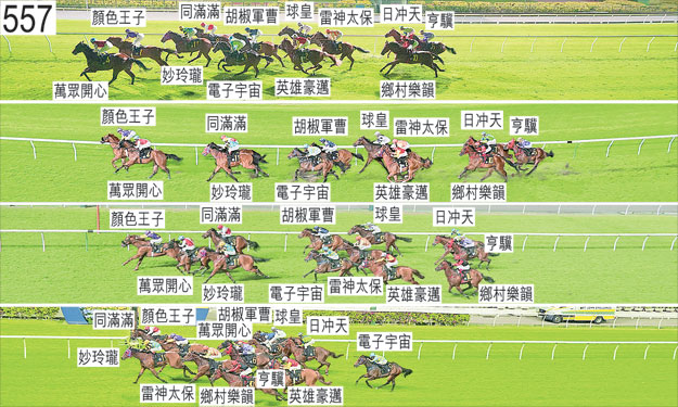 「英雄豪邁」躍出時被碰撞後軀。接近七百米處時在受「電子宇宙」(董明朗)擠迫之際收慢,當時「電子宇宙」在尚未帶離下向內移入。小組告誡董明朗須加倍小心。賽後立即接受獸醫檢查,並無發現任何明顯異常之處。 「胡椒軍曹」起步後不久發生碰撞。接近六百米處時與「電子宇宙」雙雙斜跑之際與該駒互相碰撞。 「萬眾開心」末段內閃,難以被力策至終點。 「雷神太保」出閘僅屬一般。 「亨驥」躍出時向外斜跑,與「英雄豪邁」互相觸碰。 「日冲天」出閘僅屬一般,其後不久與略為向內斜跑的「胡椒軍曹」互相碰撞。接近二百五十米處時移至「球皇」外側以望空。接近一百米處時在「胡椒軍曹」之後受困而未能望空,接近五十米處時移至該駒內側,其後在「萬眾開心」之後受困之際未能被力策至終點。 「同滿滿」被查詢有關他在直路上的騎法,以及他試圖將坐騎向外移出以望空的原因時,潘明輝表示,他獲指示於直路上嘗試將坐騎移出外疊以望空。他說,因此他讓坐騎跟隨「顏色王子」,繼而選擇讓坐騎移至該駒外側以圖在「萬眾開心」外側望空。他說,他決定這樣做是受到策騎指示影響,也由於他預期「顏色王子」及「萬眾開心」會在直路彎走外疊後向內移回內欄。他說,當「萬眾開心」保持離欄競跑時,坐騎於趨近三百米處時在該駒與「妙玲瓏」之間未能望空,導致他於接近二百五十米處時須將坐騎移回內疊以望空。練馬師伍鵬志確認他傾向潘明輝在直路上將此駒移出外疊,但在此情況下滿意潘明輝採取的策略。考慮到策騎指示,小組同樣認為潘明輝在此情況下採取的策略屬合理。賽後須抽取樣本檢驗。 「電子宇宙」起步後不久發生碰撞。接近六百米處時發生碰撞。大部分途程走外疊,沒有遮擋。 「鄉村樂韻」起步後不久在受略為向內斜跑的「電子宇宙」擠迫之際失蹄。 「妙玲瓏」賽後須抽取樣本檢驗。 「球皇」出閘僅屬一般。接近六百米處時受「胡椒軍曹」擠迫,當時「胡椒軍曹」在與「電子宇宙」互相觸碰後向內斜跑。