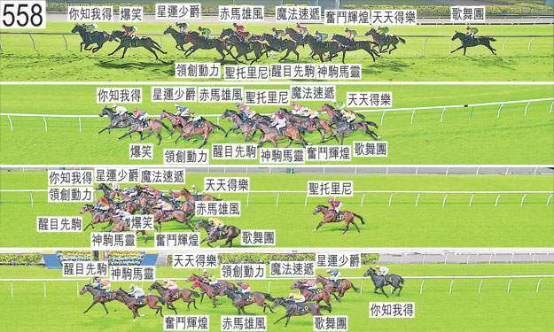 「爆笑」被查詢時,潘頓未能就坐騎令人失望的表現提供任何解釋。練馬師告東尼表示,他認為此駒能在領放下主宰大局時表現最佳,而這是他能夠對此駒令人失望的表現提供的唯一解釋。賽後立即接受獸醫檢查,並無發現任何明顯異常之處。小組認為與近仗相比,「爆笑」今仗的表現令人失望。「爆笑」必須試閘及格,並且通過獸醫檢驗後,才可再次出賽。賽後須抽取樣本檢驗。 「領創動力」起步時發生碰撞。 「天天得樂」轉直路彎時受困。趨近二百米處時在「星運少爵」之後再度受困而未能望空直至趨近一百五十米處。接近一百米處時在一段短途程上在「星運少爵」與「赤馬雄風」之間緊迫競跑。 「你知我得」練馬師姚本輝表示,他指示蔡明紹讓此駒自大外檔出閘後上前,因為他覺得若馬匹在C+3跑道上自大外檔出閘後留後會難以從後追前,不利此駒發揮。 「赤馬雄風」三百米處至一百米處之間受困而未能望空。 「星運少爵」接近二百米處時被「魔法速遞」大力碰撞後軀,因而嚴重失去平衡。賽後,艾道拿報告,他獲指示讓坐騎佔取前列位置。練馬師方嘉柏確認所發出的指示。賽後立即接受獸醫檢查,發現此駒右後腿管骨部位輕微割傷。 「醒目先駒」董明朗因於接近三百五十米處時造成干擾而承認一項不小心策騎(見「聖托里尼」)。賽後須抽取樣本檢驗。 「奮鬥輝煌」過了二百米處後向內移入以佔取「領創動力」與「醒目先駒」之間的窄位,因而與「領創動力」互相觸碰,其後在一段途程上難以望空。 「歌舞團」出閘緩慢。接近三百五十米處時收慢,並移至「聖托里尼」外側以避開該駒。 「聖托里尼」起步時發生碰撞。董明朗(「醒目先駒」)承認一項不小心策騎〔賽事規例第100(1)條〕,事緣於接近三百五十米處時,他容許坐騎在尚未帶離「聖托里尼」下向外移出至「領創動力」外側,導致「聖托里尼」在「神駒馬靈」與「醒目先駒」之間失去應有跑線之際須勒避。小組判罰董明朗於四月十三日星期日沙田賽事停賽(一個香港賽馬日)。在衡量判罰輕重時,小組裁定董明朗的不小心策騎程度屬第二級,以及影響情況屬第二級,也考慮了他的甚佳策騎出賽紀錄。大部分途程在沒有遮擋下走外疊。賽後立即接受獸醫檢查,並無發現任何明顯異常之處。 「神駒馬靈」賽後須抽取樣本檢驗。 「魔法速遞」早段搶口,接近千二米處時收慢避開「赤馬雄風」。轉直路彎時受困。湯普新(「魔法速遞」)承認一項不小心策騎〔賽事規例第100(1)條〕,事緣於接近二百米處時,他嘗試讓坐騎在「你知我得」與「星運少爵」之間空位不足處強行取位,導致坐騎在無路可上之際須大力勒避,並與「星運少爵」互相大力觸碰,「星運少爵」因而嚴重失去平衡。小組判罰湯普新由四月九日星期三開始停賽,直至四月十七日星期四才可再次出賽(三個香港賽馬日)。在衡量判罰輕重時,小組裁定湯普新的不小心策騎程度屬第三級,以及影響情況屬第二級,也考慮了他的良好策騎出賽紀錄。 「燊榮之星」三月三十一日被小組按照獸醫意見(發燒)著令退出,並由後備馬匹「領創動力」補上。「燊榮之星」必須通過獸醫檢驗後,才可再次出賽。