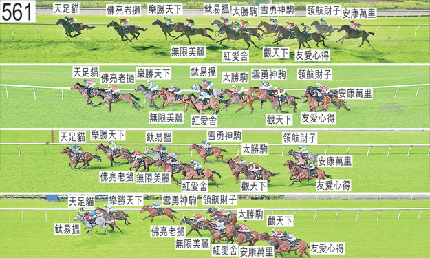 | 「鈦易搵」賽後須抽取樣本檢驗。 「觀天下」接近九百米處時開始搶口,在收慢避開「太勝駒」之際急促向外斜跑。此駒於直路上對潘頓的催策毫無反應,小組認為與近仗相比,此駒今仗的表現令人失望。「觀天下」必須試閘及格,並且通過獸醫檢驗後,才可再次出賽。賽後立即接受獸醫檢查,並無發現任何明顯異常之處。 「無限美麗」賽後立即接受獸醫檢查,內窺鏡檢查顯示此駒的氣管內有很多血。「無限美麗」必須通過獸醫檢驗後,才可再次出賽。賽後被發現失去左後蹄的蹄鐵。 「友愛心得」自外檔出閘僅屬一般,早段在馬群之後切入。接近九百米處時在被「觀天下」帶出較外疊之際受阻礙。賽後,班德禮表示,他獲指示讓坐騎於早段留後競跑,以抵銷自外檔出閘的影響。他說,坐騎於接近六百米處時被「觀天下」迫出更外疊,其後須在沒有遮擋下走大外疊,因而於直路上未能以勁勢衝刺。賽後立即接受獸醫檢查,並無發現任何明顯異常之處。 「天足貓」賽後須抽取樣本檢驗。 「佛亮老撾」賽後,艾道拿表示,他獲指示讓坐騎上前,並盡可能嘗試領放。他又說,坐騎衝刺僅屬一般,他認為坐騎若於早段以較為留後的方式競跑可能更合發揮。賽後立即接受獸醫檢查,並無發現任何明顯異常之處。賽後須抽取樣本檢驗。 「紅愛舍」大部分途程走外疊,沒有遮擋。 「安康萬里」自大外檔出閘後於早段在馬群之後切入。被查詢時,希威森表示,他獲指示讓自大外檔出閘的坐騎於早段留後競跑。他說,坐騎居後列,他於轉直路彎時選擇讓坐騎跟隨「觀天下」上前,因為他覺得該駒將給予坐騎最佳機會推進上前。他說,當「觀天下」未有如他預期般上前時,坐騎在該駒之後受困而未能望空,在他認為空位不足時未能在該駒與「太勝駒」之間推進。他說,坐騎因而在三百米處至二百米處之間受困而未能望空,他在坐騎移至「太勝駒」外側後能夠在一段短途程上催策坐騎上前。他又說,坐騎於接近一百五十米處時在「紅愛舍」之後推進,其後他選擇開始讓坐騎推進至該駒內側以望空,但當該駒向內斜跑時,坐騎在該駒之後處於窘境,因此他須收慢坐騎及將牠移至該駒外側,坐騎於跑過一百米處時望空。考慮了希威森的解釋後,小組認為他在此情況下採取的競跑策略屬合理。 「太勝駒」早段在收慢以佔取有遮擋的位置之際搶口。接近二百米處時在「無限美麗」之後受困之際難以望空。 「樂勝天下」接近一千米處首次轉彎時外閃。接近九百米處時在一度受「佛亮老撾」擠迫之際收慢,當時「佛亮老撾」向內斜跑,繼而被騎師修正。 「領航財子」接近九百米處時收慢及向內移入避開「觀天下」。
