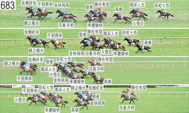 「錶之極光」過了九百米處後在一段短途程上在「手到齊來」向外斜跑避開「良駒好友」之際被帶出較外疊。賽後,潘頓未能就坐騎令人失望的表現提供任何解釋。賽後立即接受獸醫檢查,並無發現任何明顯異常之處。 「手到齊來」接近九百米處時收慢避開「良駒好友」(見習騎師黃寶妮),當時「良駒好友」在尚未帶離下向內移入,並於其後減慢步速。小組嚴厲譴責見習騎師黃寶妮,並告誡她在轉換跑線時須已充分帶離,也不要如今次般過於急促地收慢步速。在此宗事件中,此駒其後向外斜跑避開「良駒好友」,與「錶之極光」互相觸碰。賽後須抽取樣本檢驗。 「火悟空」出閘僅屬一般,其後不久在與「彩虹七色」互相大力碰撞之際失去平衡。接近四百米處時在「風采人生」移至「金快飛飛」內側以望空之際與該駒互相觸碰。賽後須抽取樣本檢驗。 「金快飛飛」出閘僅屬一般。直路上在催策下外閃,霍宏聲須於接近二百米處時修正坐騎。賽後,霍宏聲表示對坐騎的後肢動作有疑慮。賽後立即接受獸醫檢查,並無發現任何明顯異常之處。「金快飛飛」必須通過獸醫檢驗後,才可再次出賽。 「勝在有型」出閘笨拙。接近六百五十米處時失蹄。 「良駒好友」直路上在催策下外閃。接近二百米處時,見習騎師黃寶妮跌掉馬鞭。由於這已是見習騎師黃寶妮今季第三次於陣上跌掉馬鞭,因此小組向她發出警告。 「彩虹七色」躍出時在「火悟空」與向外斜跑的「風采人生」之間受擠迫。 「花香月明」賽後立即接受獸醫檢查,並無發現任何明顯異常之處。 「勁者」接近一百米處時收慢避開「風采人生」(周俊樂),當時「風采人生」在尚未帶離下向內斜跑。小組告誡周俊樂須加倍小心。賽後,巴度報告,坐騎於陣上發出異常呼吸聲。賽後立即接受獸醫檢查,並無發現任何明顯異常之處。 「風采人生」起步時向外斜跑及被碰撞。中段搶口,接近六百五十米處時收慢避開「勝在有型」。過了四百米處後,「風采人生」(周俊樂)及「火悟空」(艾兆禮)爭奪「勁者」與「金快飛飛」之間的位置,而當時該處不足以讓兩駒推進。此駒因而在「勁者」與「火悟空」之間受擠迫之際失去平衡。小組告誡周俊樂及艾兆禮在類似情況下均須加倍小心。趨近一百米處時收慢,並移至「手到齊來」內側以望空。