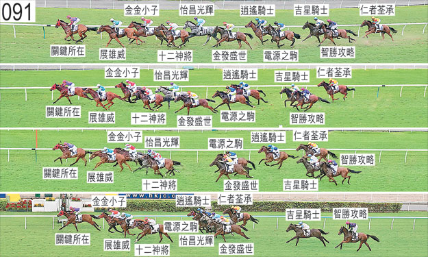 「電源之駒」起步時發生碰撞。中段搶口,趨近八百米處時在收慢避開「金發盛世」之際向外斜跑。 「金金小子」趨近九百米處時被「關鍵所在」過頭,其後在一段途程上搶口。二百米處至一百米處之間在推進至「關鍵所在」與「展雄威」之間的窄位之際在該兩駒之間緊迫競跑。賽後須抽取樣本檢驗。 「吉星騎士」躍出時與「電源之駒」互相碰撞。趨近四百米處時在向外移出以推進之際與「智勝攻略」互相觸碰。 「仁者荃承」出閘笨拙及失地。 「展雄威」賽後,巴度表示,他獲指示讓坐騎佔取前列位置。被查詢有關他於轉直路彎時及在直路早段的騎法時,巴度表示,趨近五百米處時,他在坐騎略為向內斜跑之際聽到「金金小子」的騎師潘頓呼叫。他說,他因此望向內側及修正坐騎,避免擠壓「金金小子」的跑線。他又說,坐騎於入直路時受催策之際轉腳及外閃,導致坐騎內側出現可供「金金小子」推進的空位。 「逍遙騎士」出閘僅屬一般。直路上在催策下內閃。接近五十米處時在向內斜跑的「電源之駒」內側緊迫競跑。 「關鍵所在」被查詢時,見習騎師黃智弘表示,他獲指示自外檔出閘後積極催策坐騎。他說,坐騎出閘迅速,他能夠把握快閘的優勢,讓坐騎超越內側的馬匹及領放。練馬師沈集成確認所發出的指示。賽後須抽取樣本檢驗。 「智勝攻略」趨近四百米處時被「吉星騎士」碰撞。 「怡昌光輝」賽後,艾兆禮表示,坐騎出閘緩慢,但能夠於早段展現足夠前速以佔取大熱門「金金小子」之後的前列位置。他又說,坐騎於直路早段起初對催策交出反應,但最後一百五十米衝刺乏力,末段墮退。賽後立即接受獸醫檢查,並無發現任何明顯異常之處。